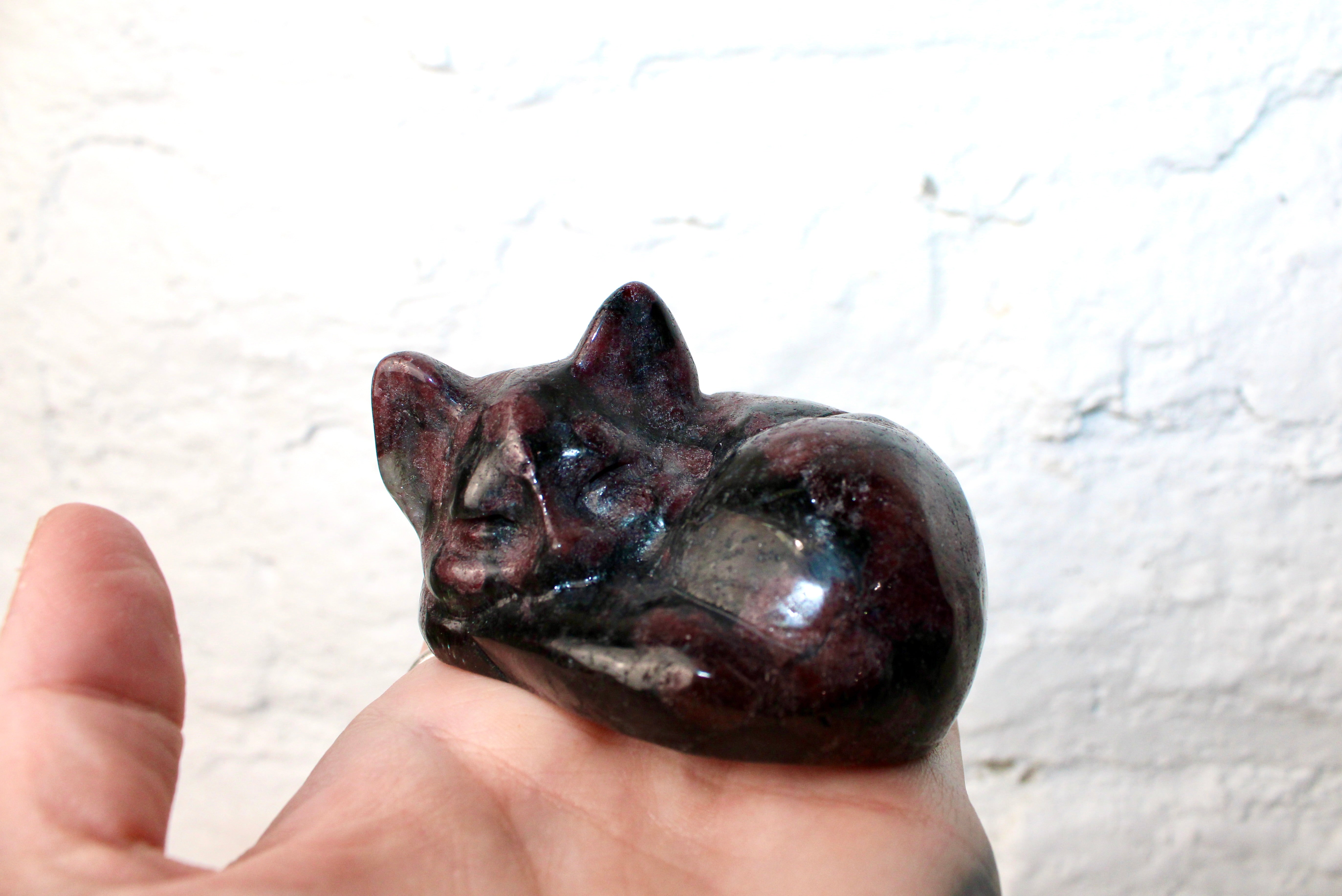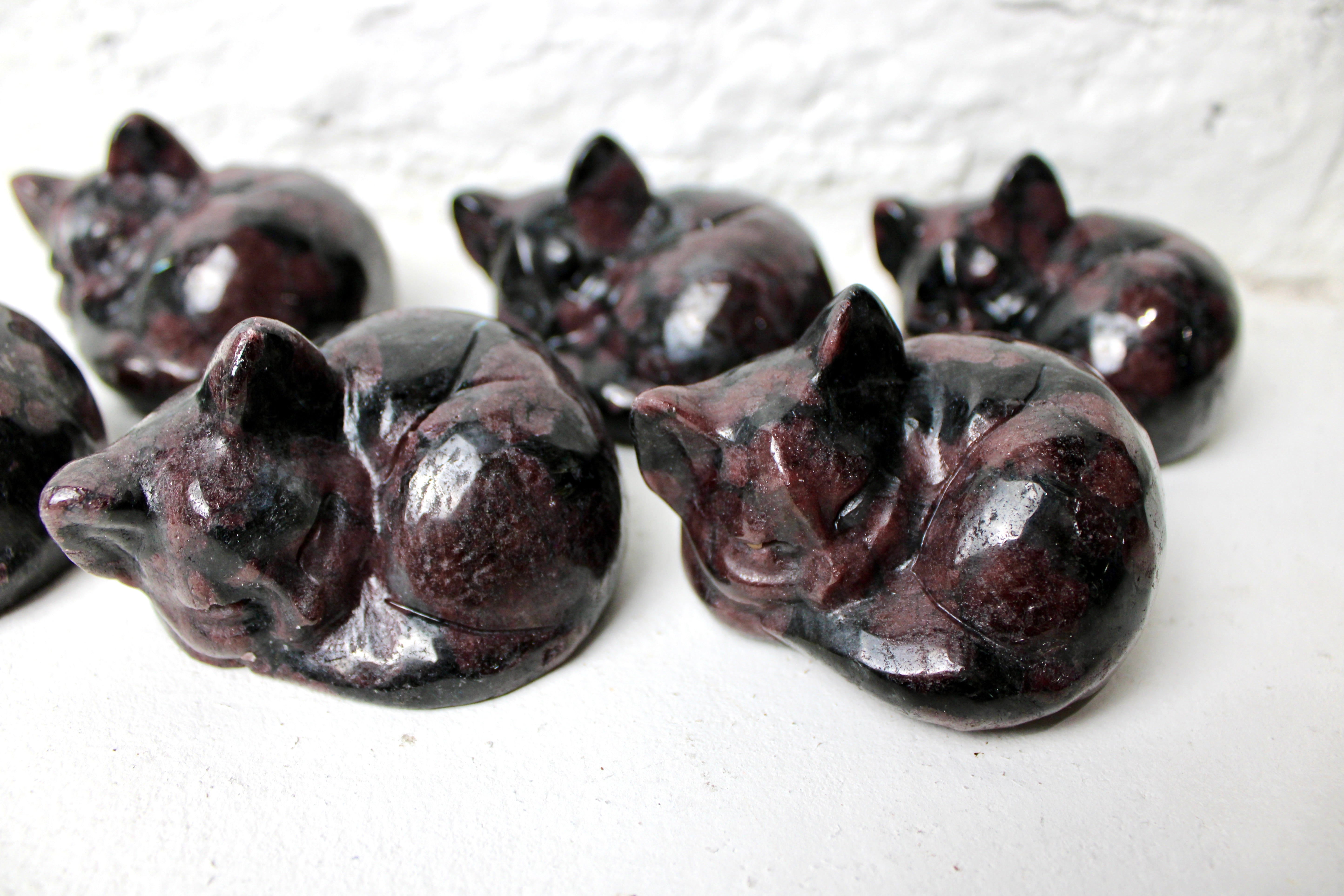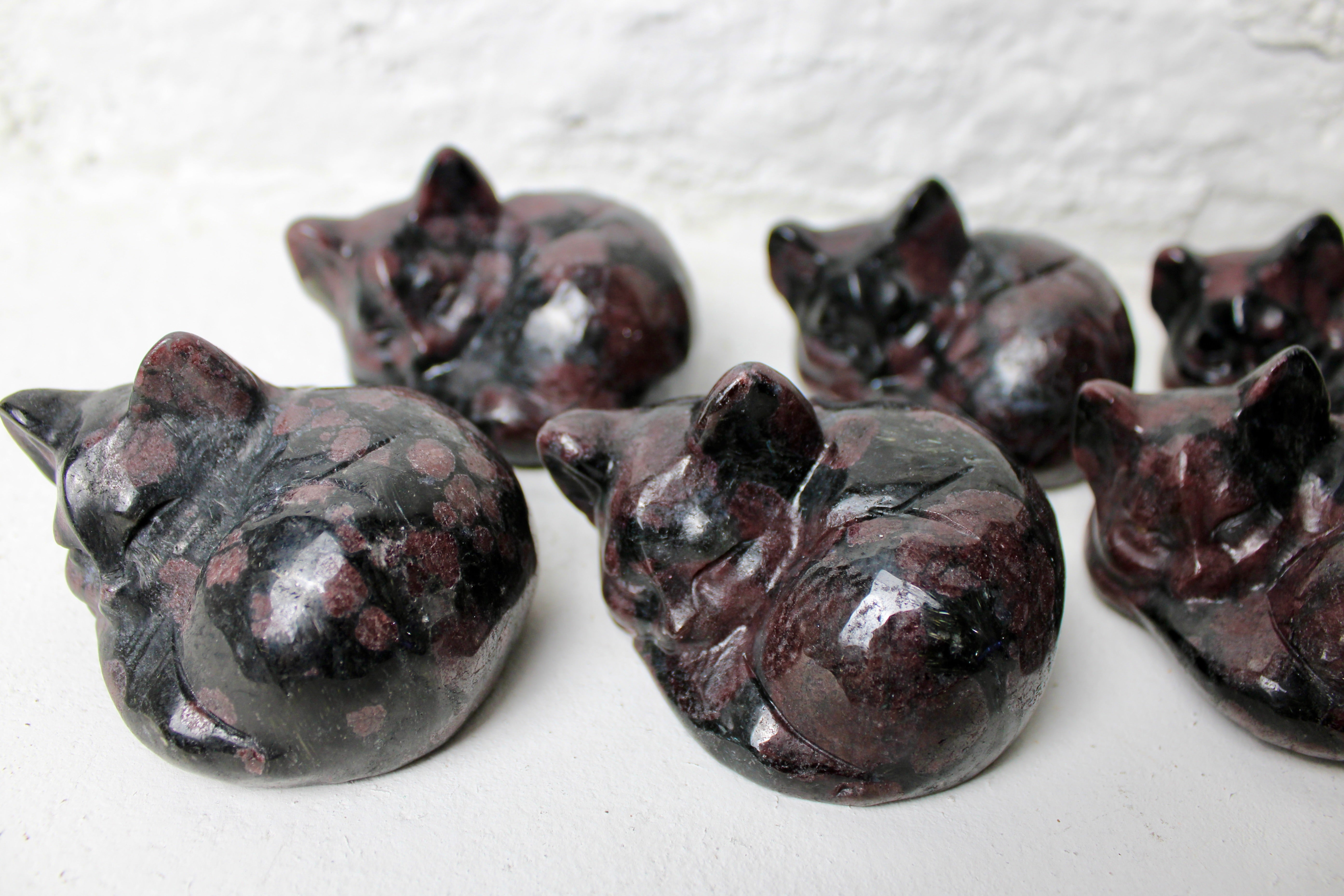 3" Garnet Sleeping Kitty Carving – Carved Natural Stone Cat Figurine, Red and Black Crystal