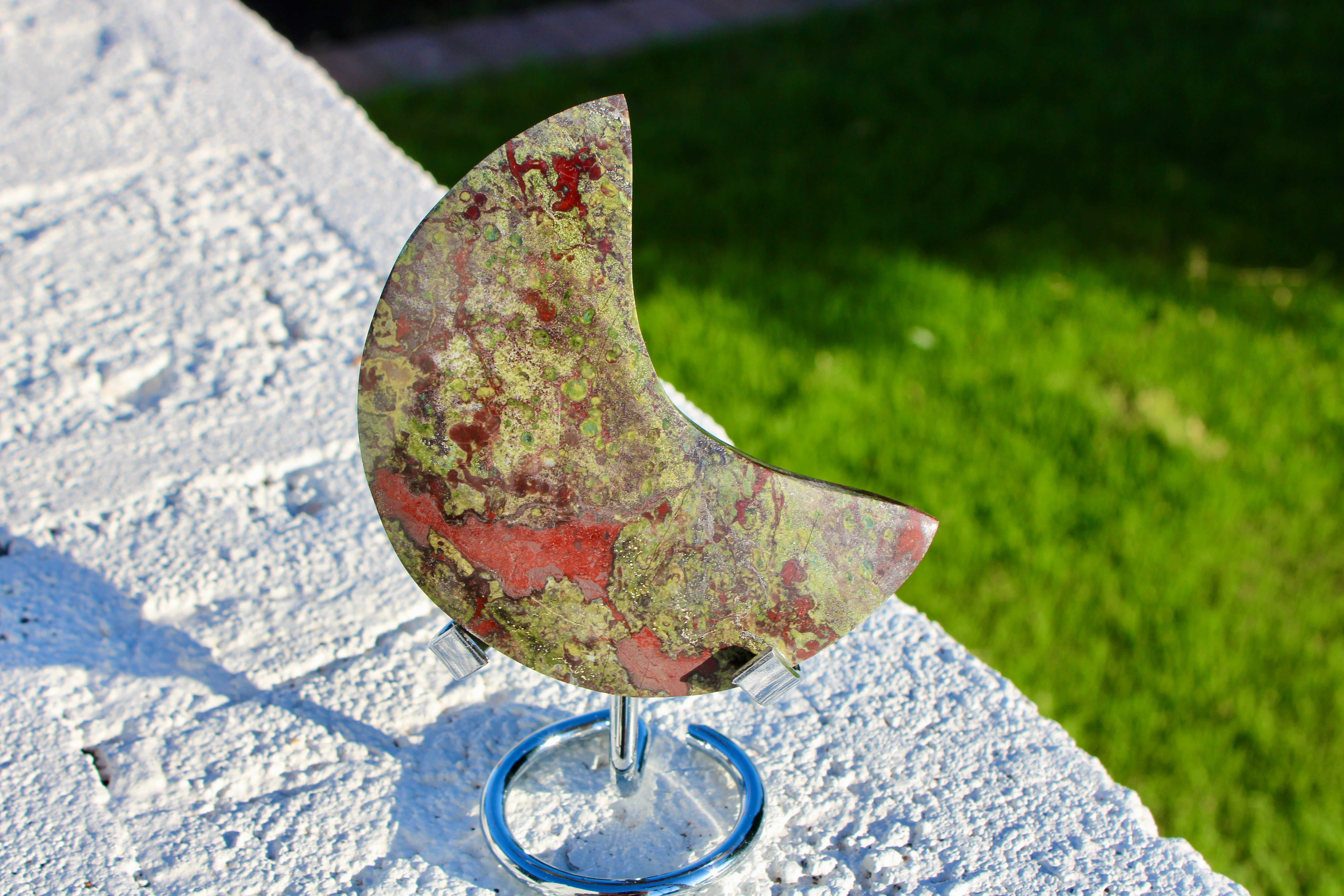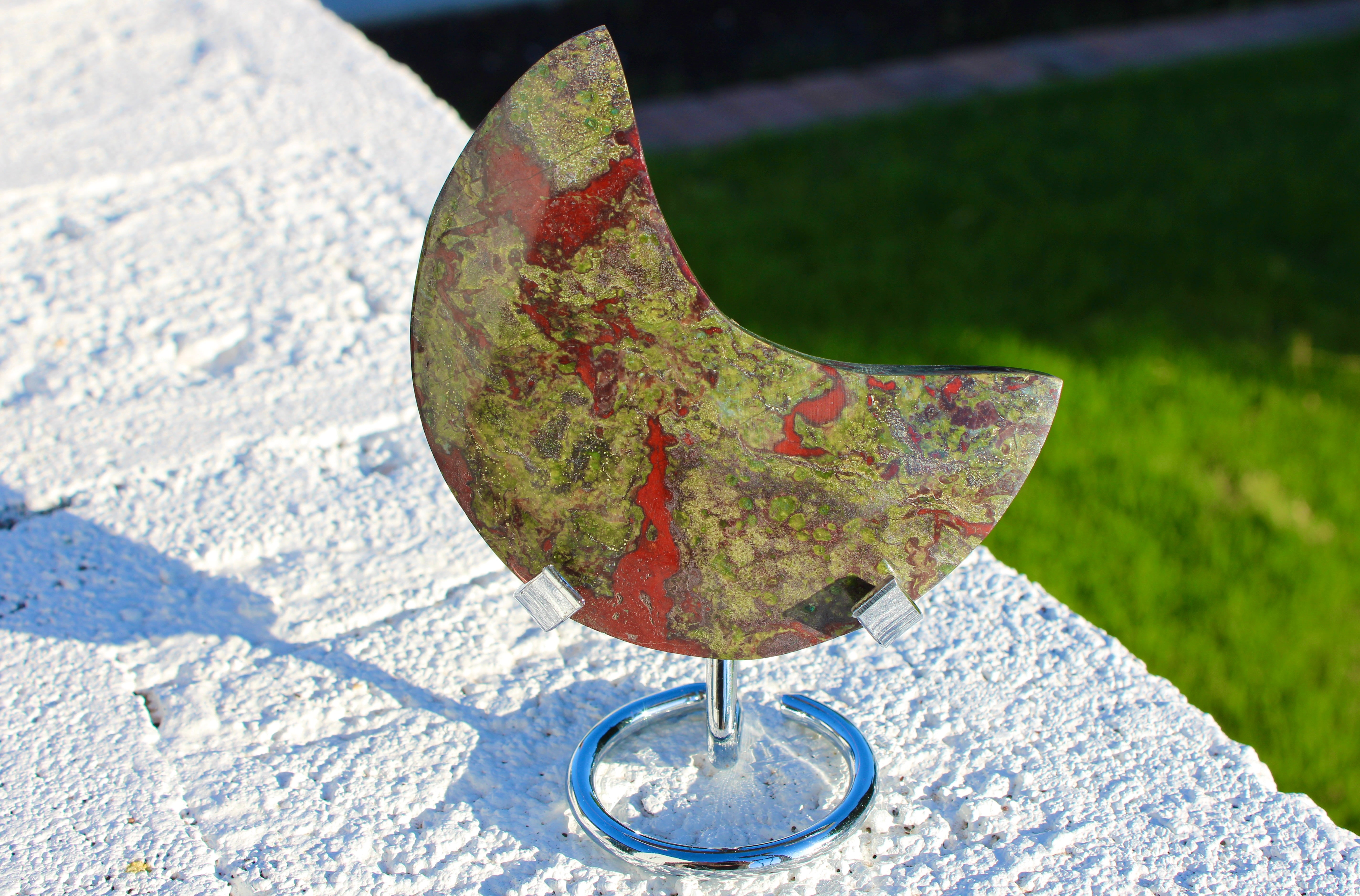 Dragon’s Blood Stone Moon – Natural Polished Crystal Moon with Display Stand, Decorative Stone Carving, Red and Green Stone Display