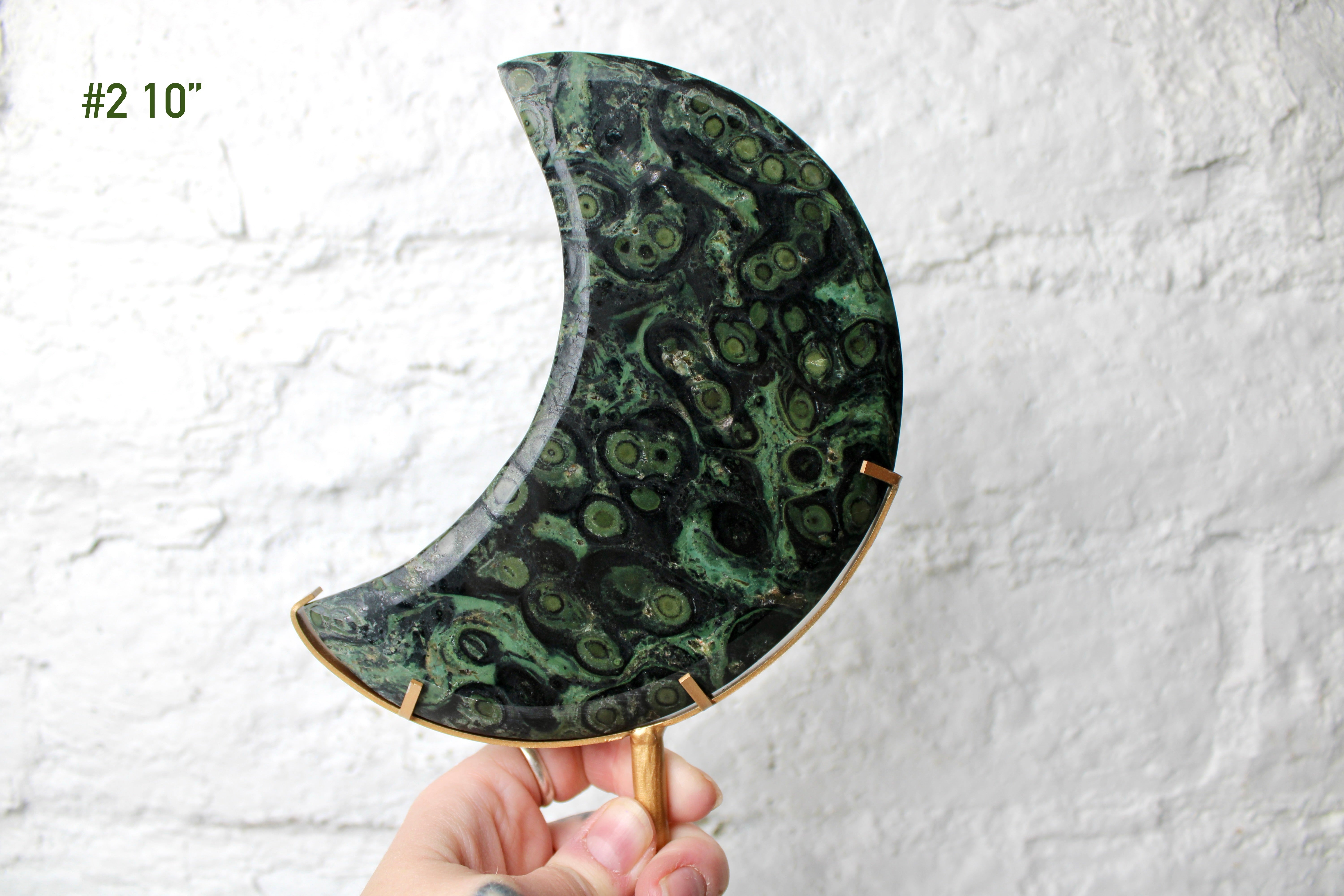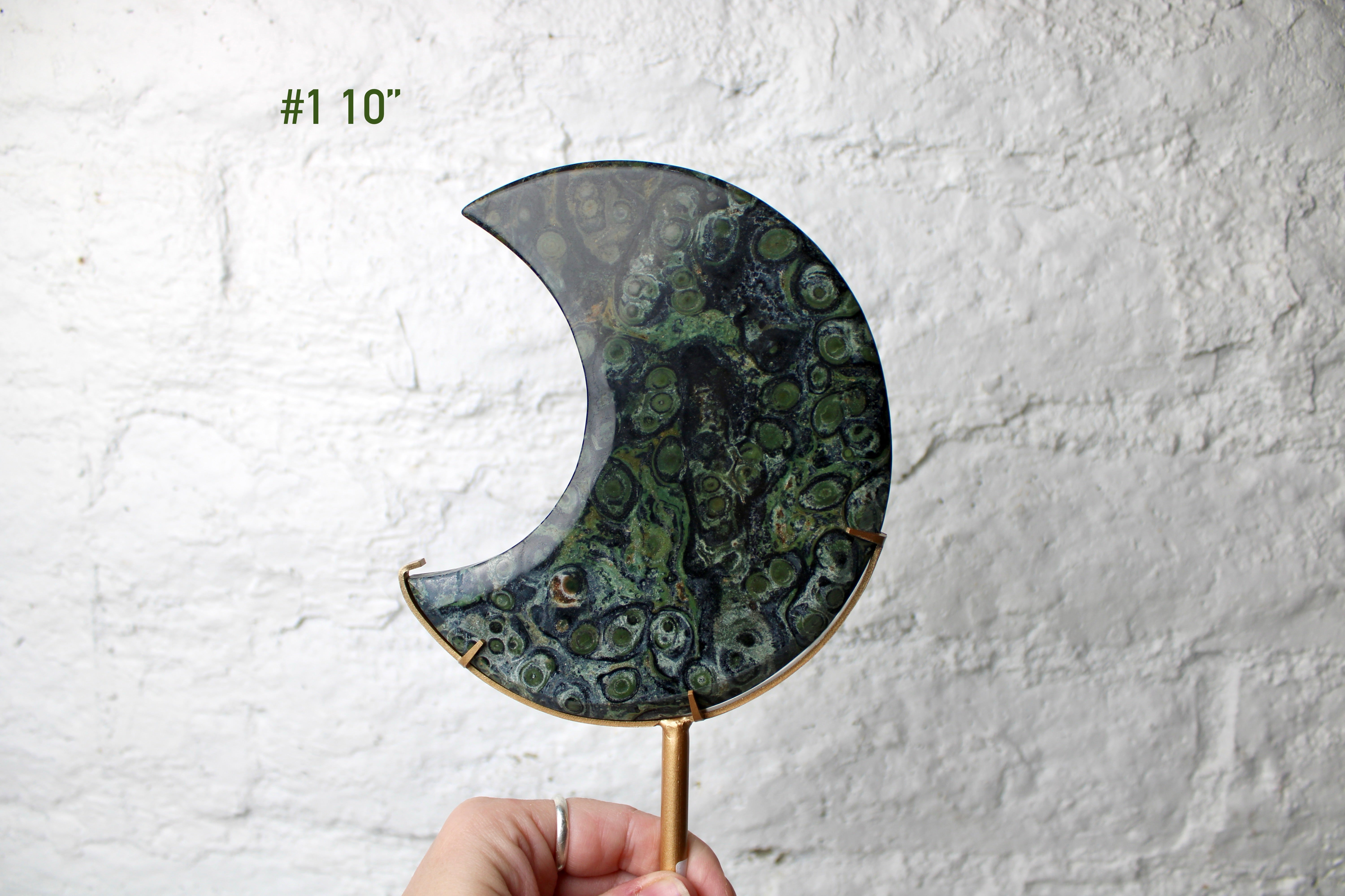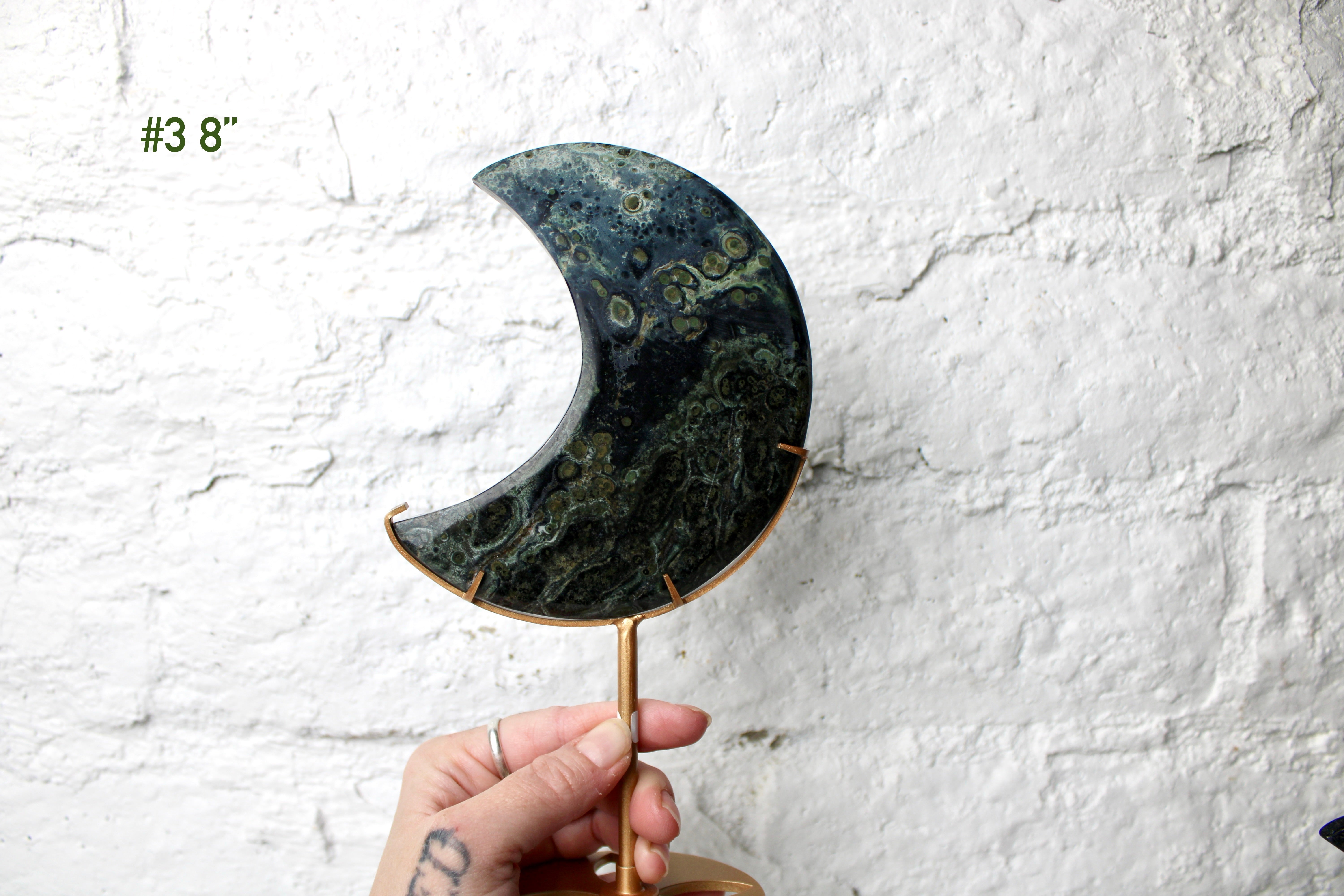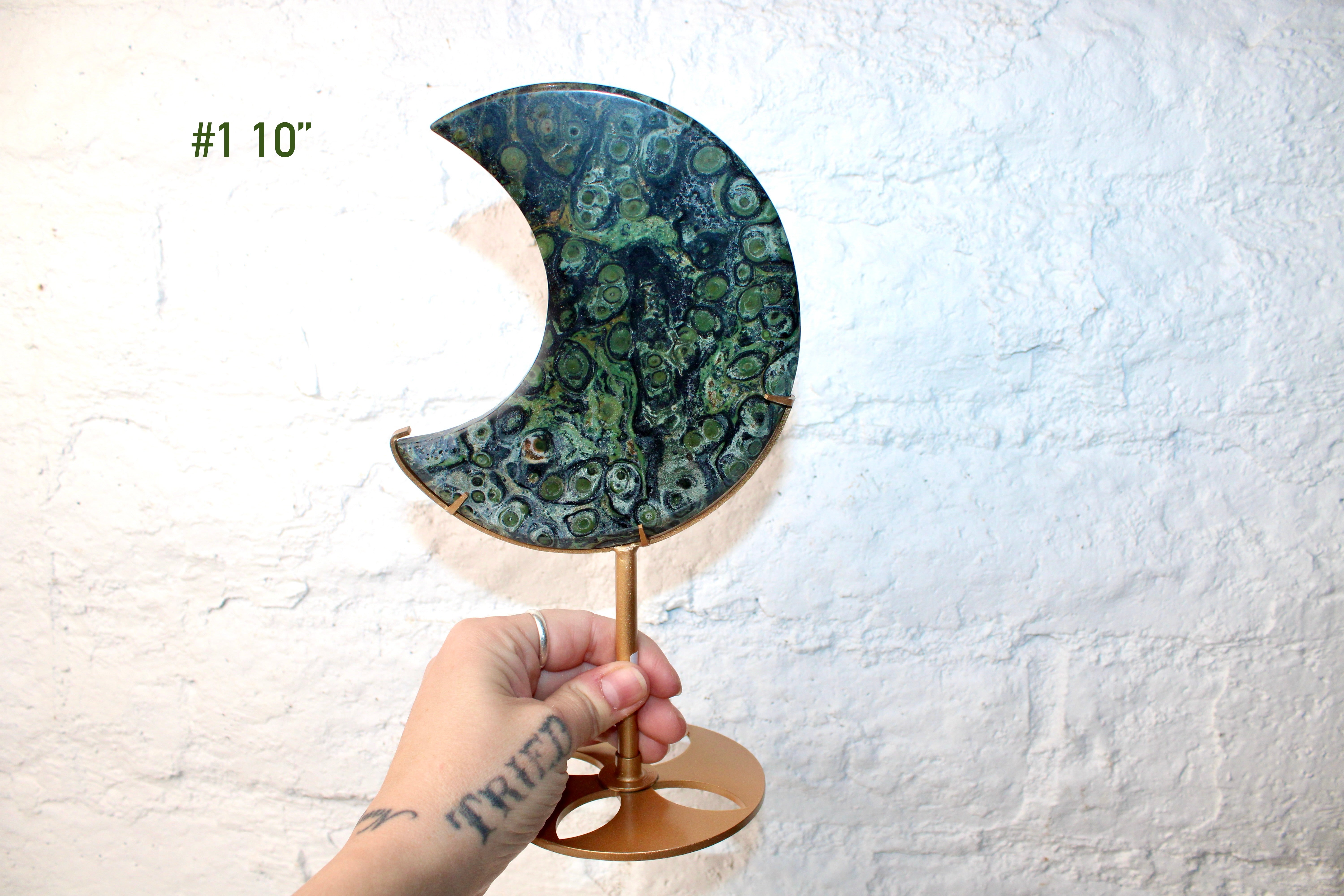 Kambaba Jasper Stone Moon with Custom Gold Display Stand - You Pick, Green Eyed Jasper Moon Statement Crystal