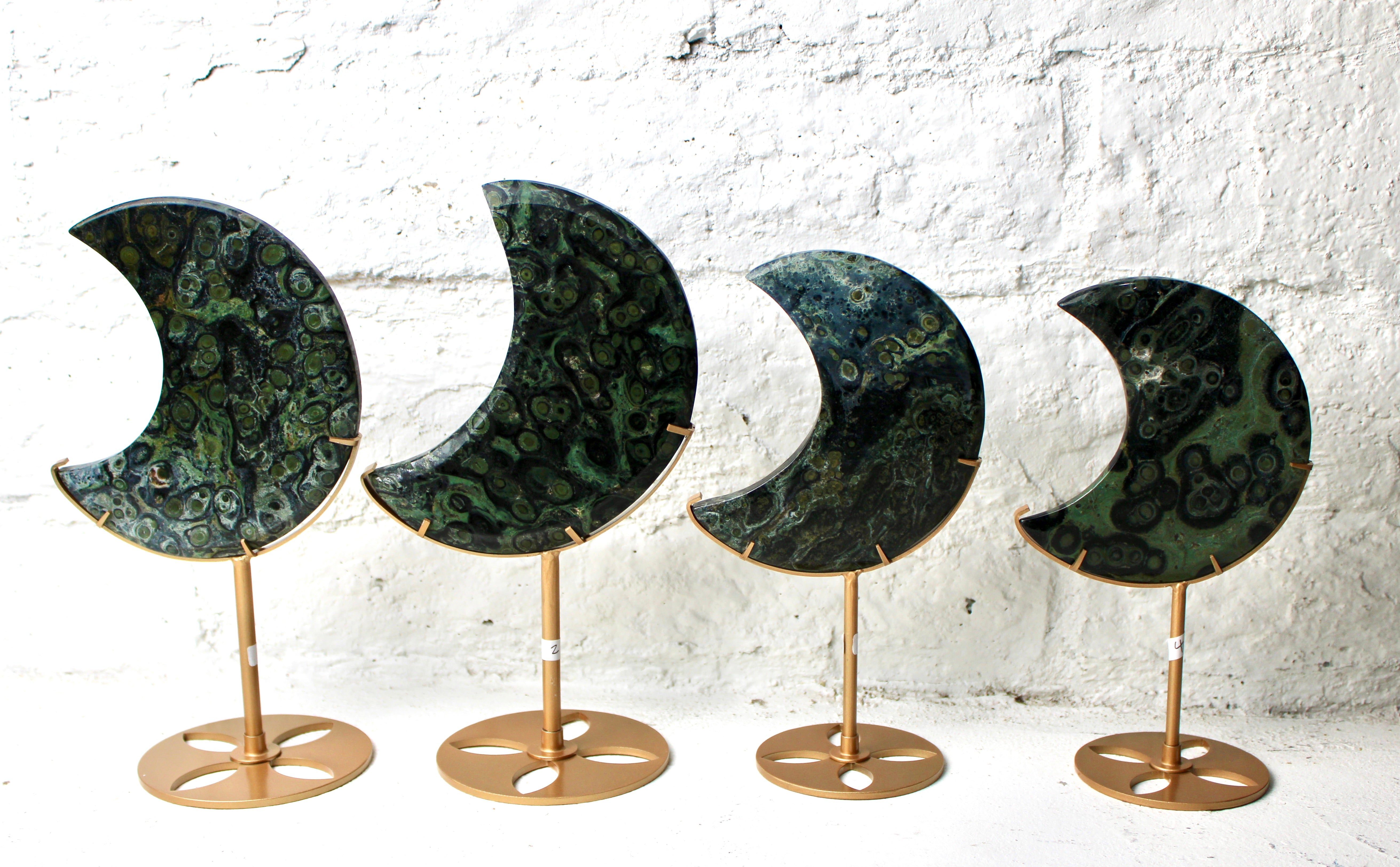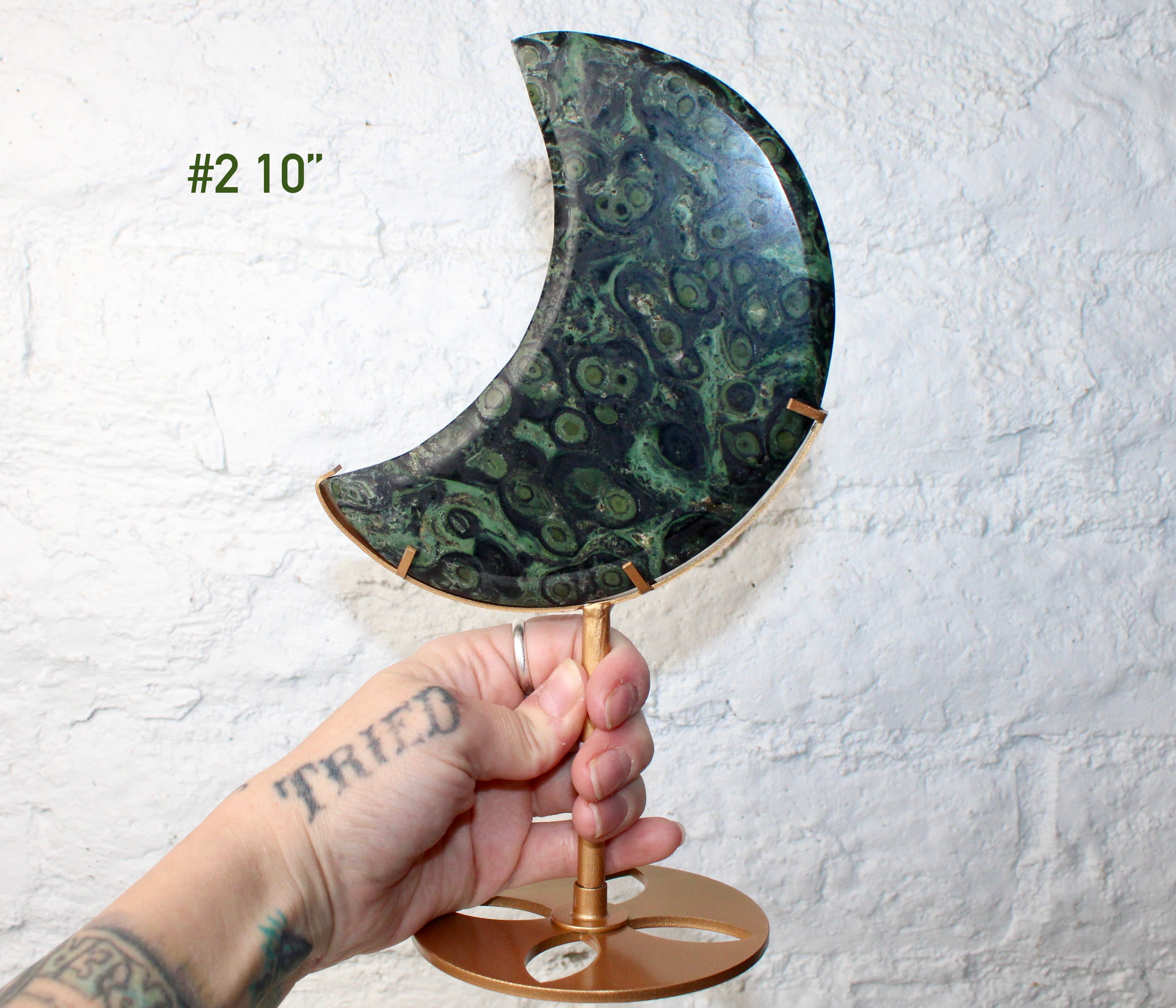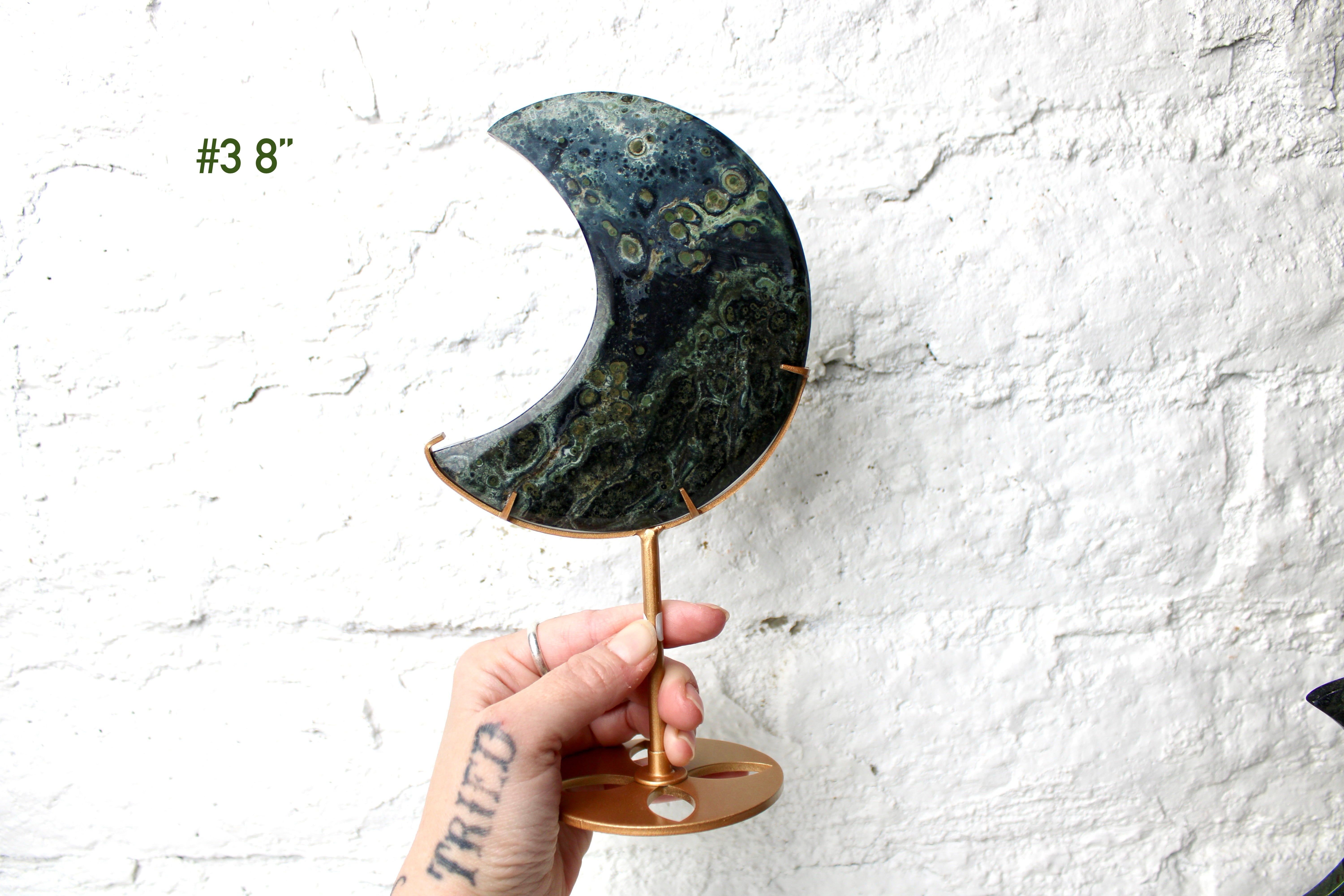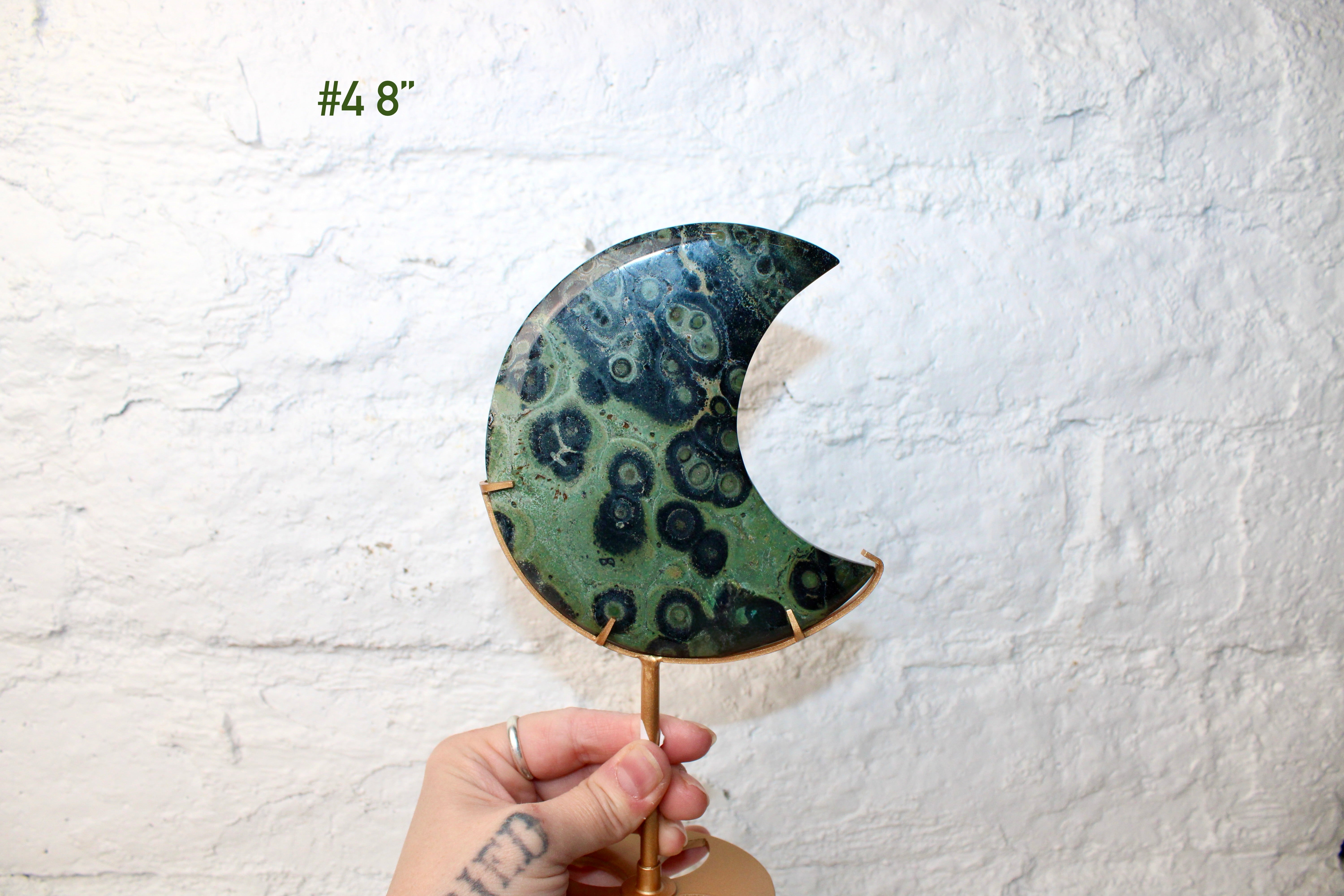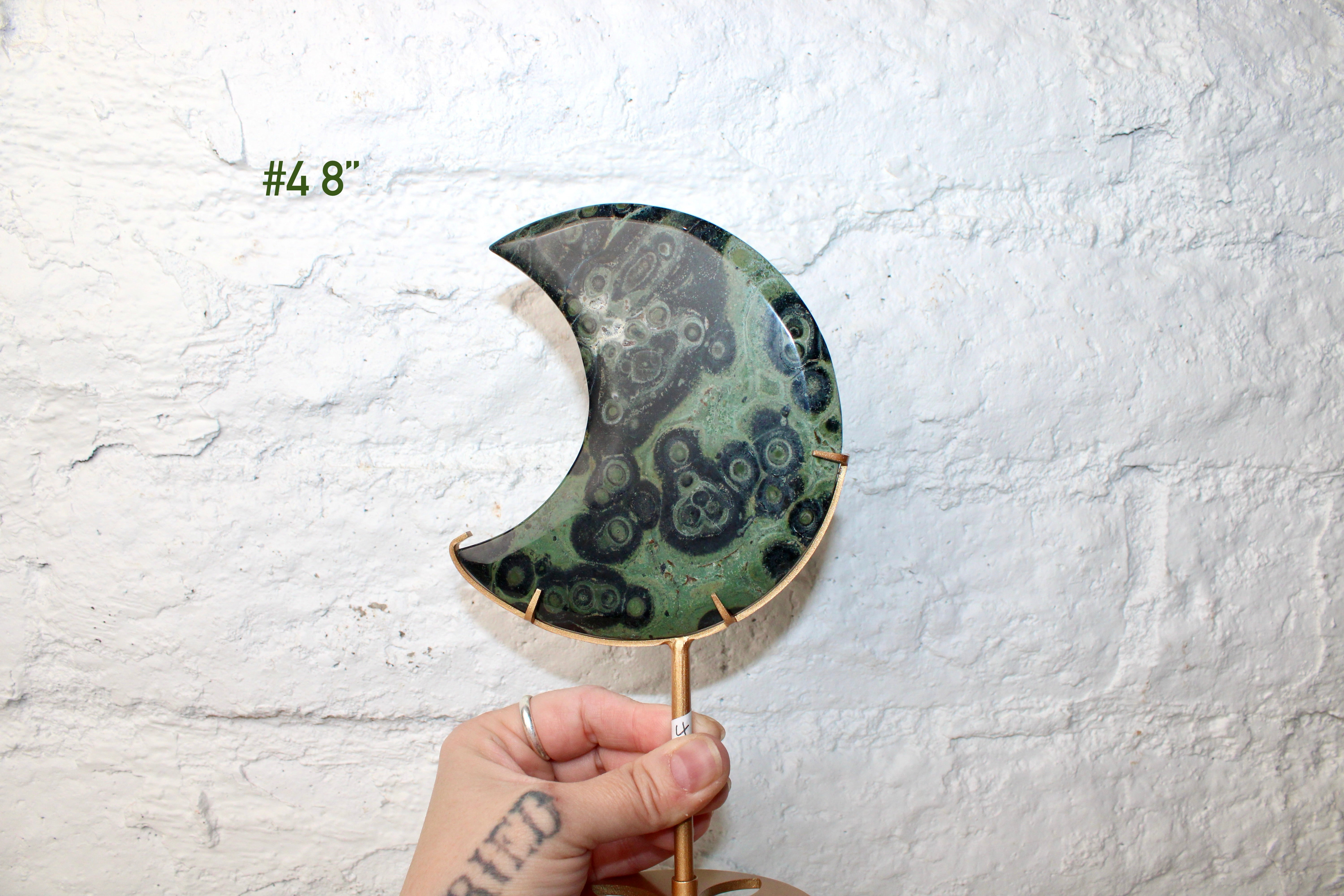 Kambaba Jasper Stone Moon with Custom Gold Display Stand - You Pick, Green Eyed Jasper Moon Statement Crystal