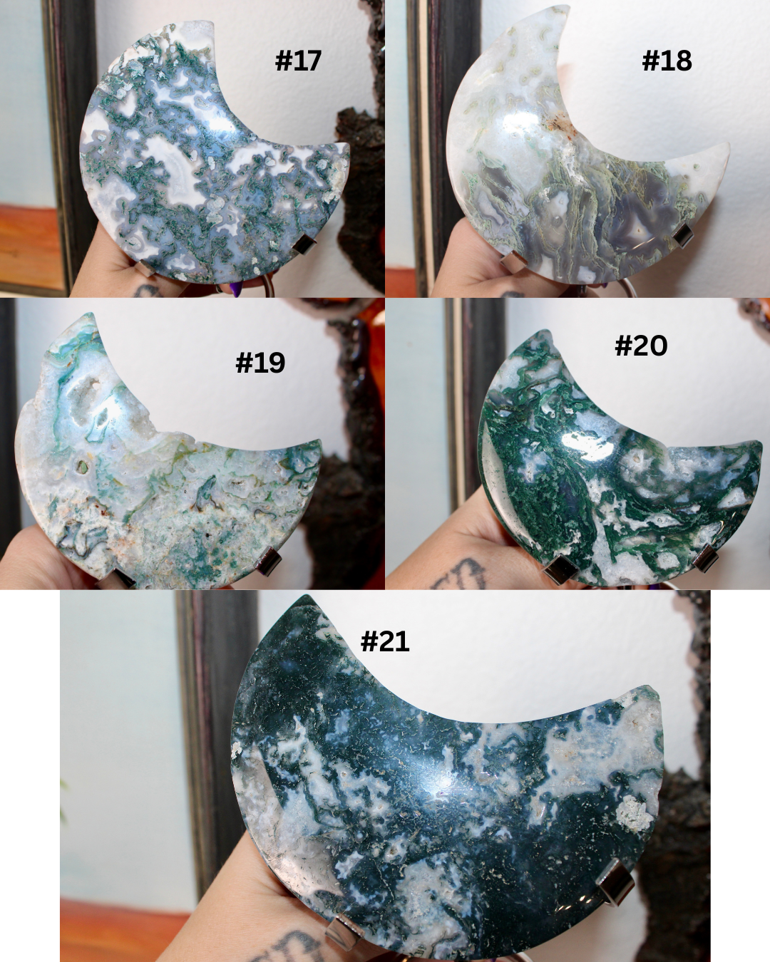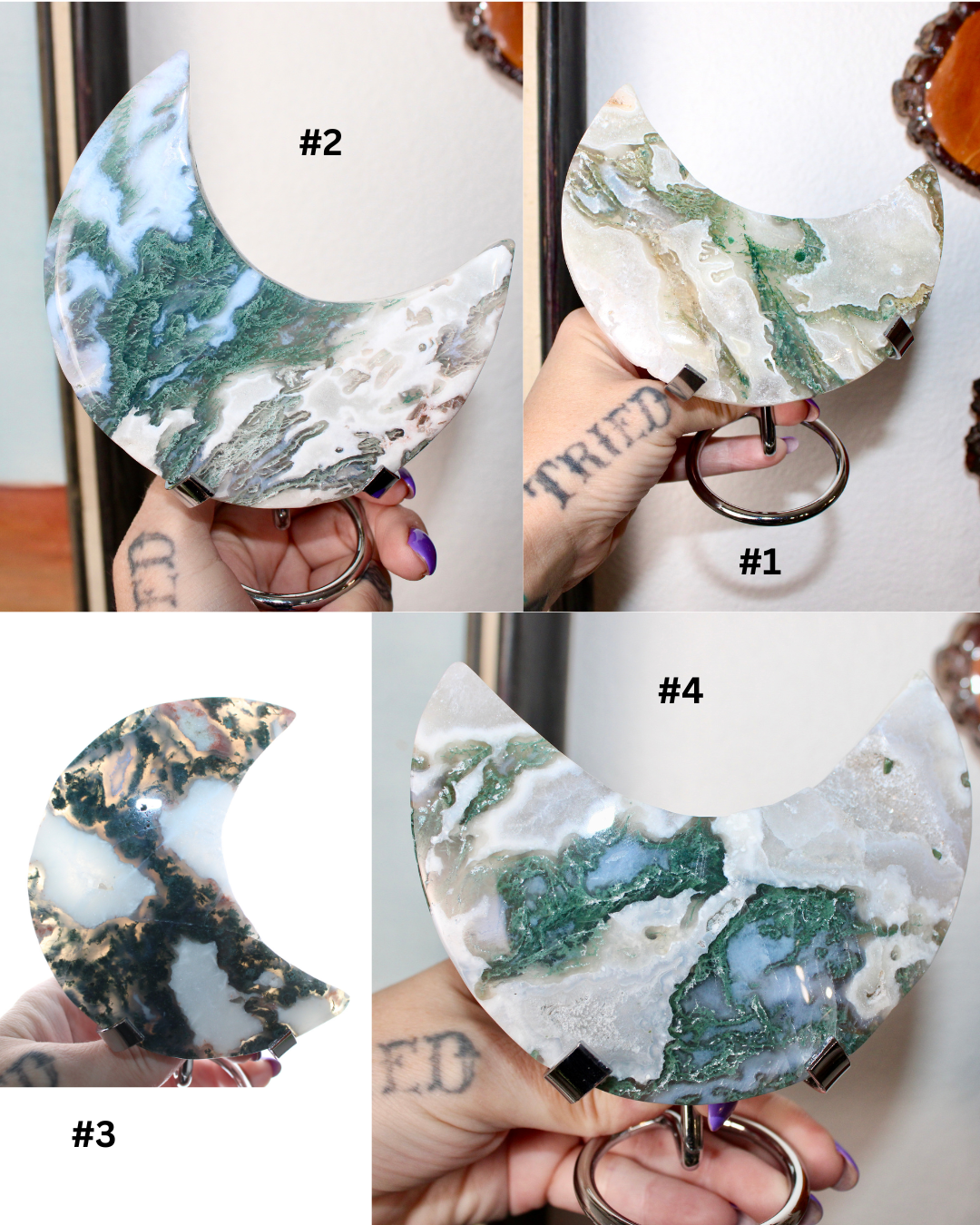 Moss Agate Moon on Metal Stand – Natural Crystal Display (You Pick!)