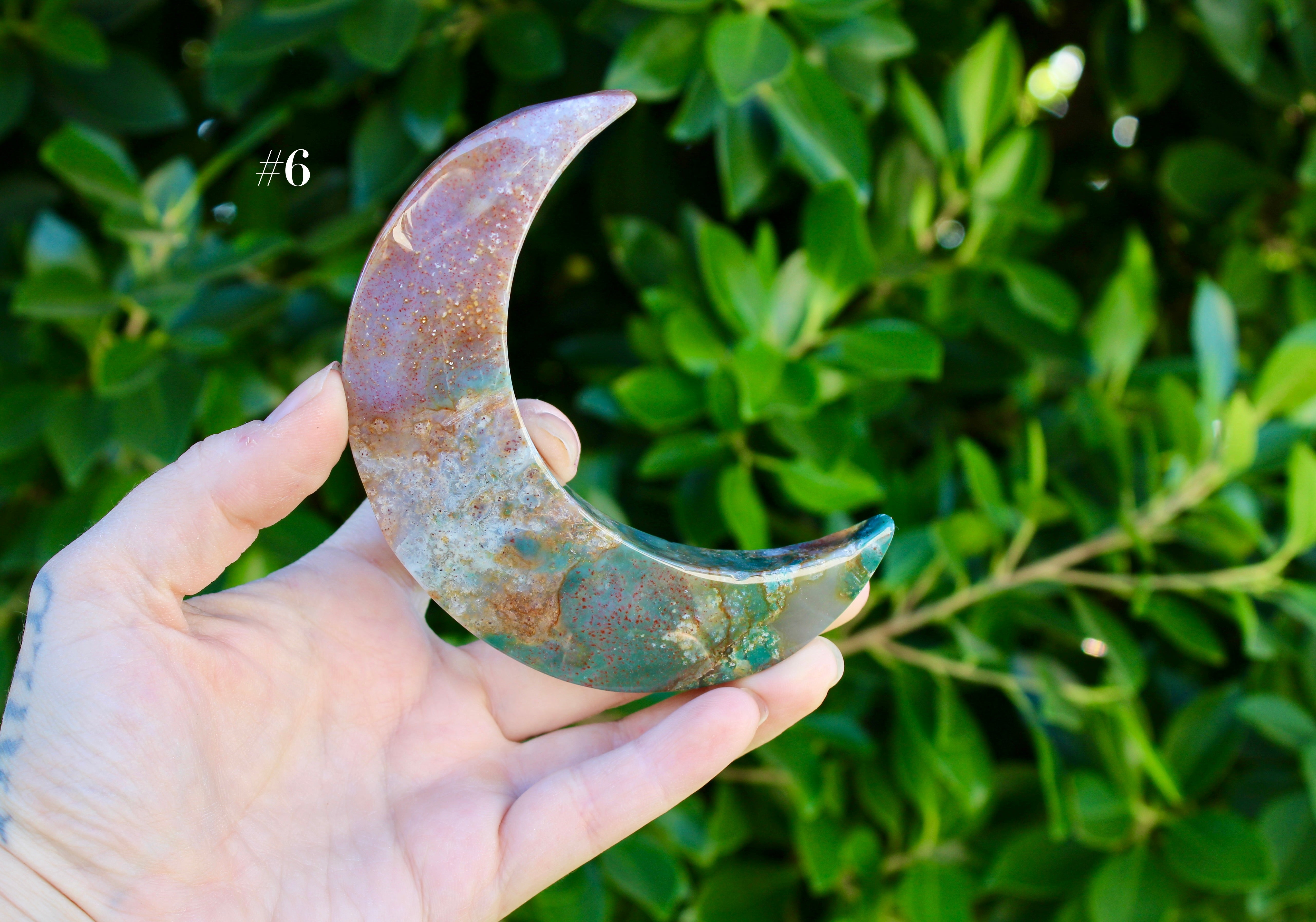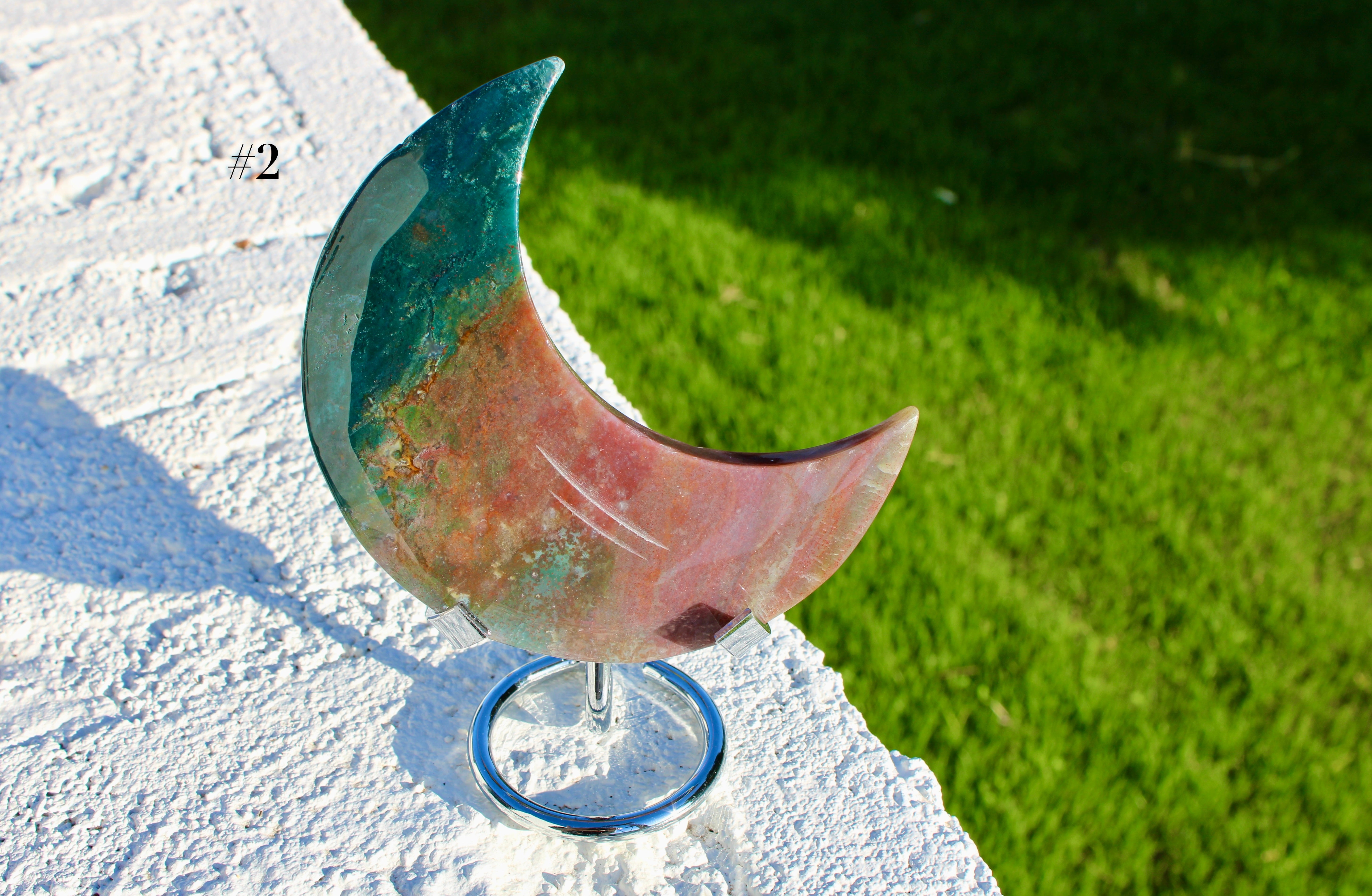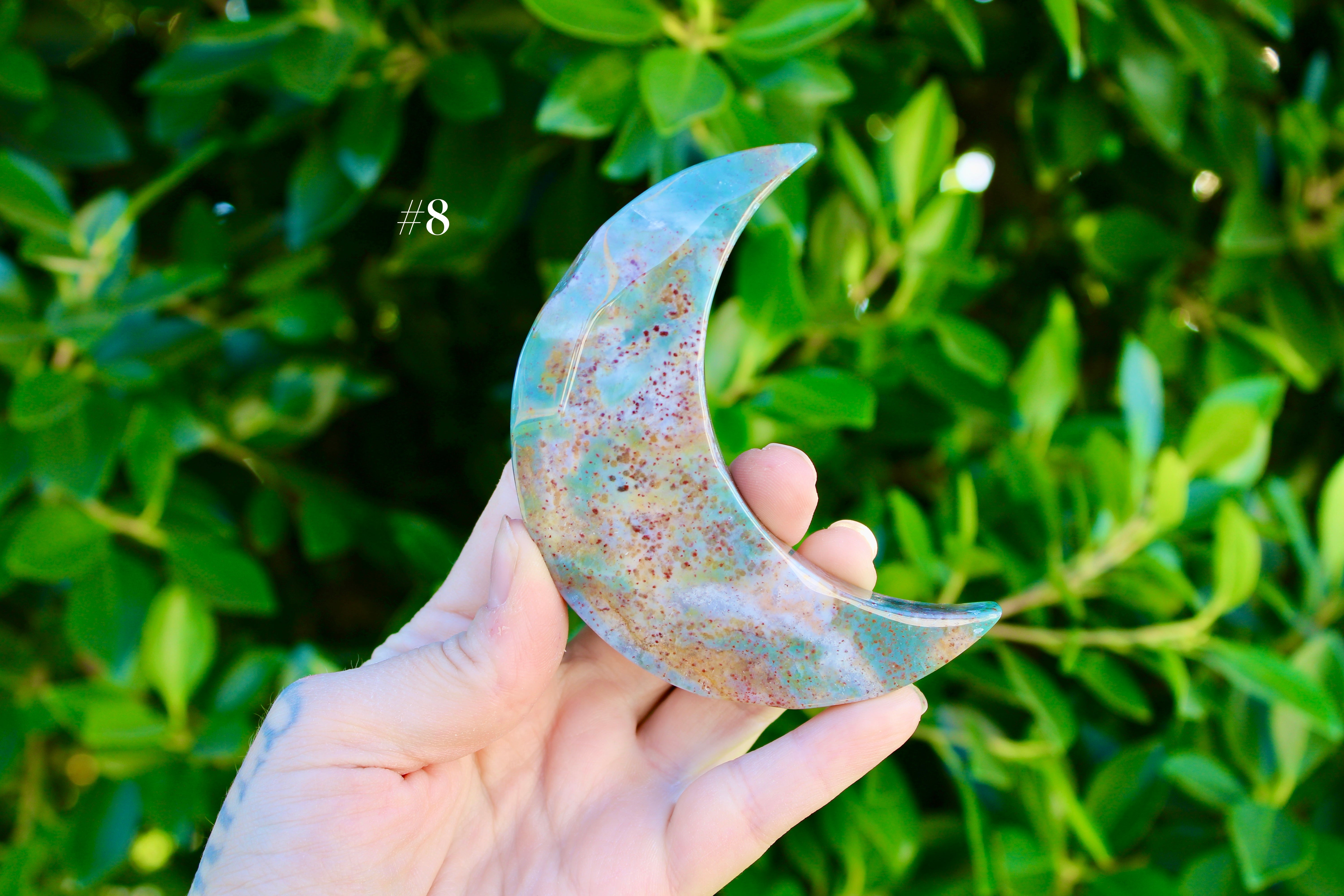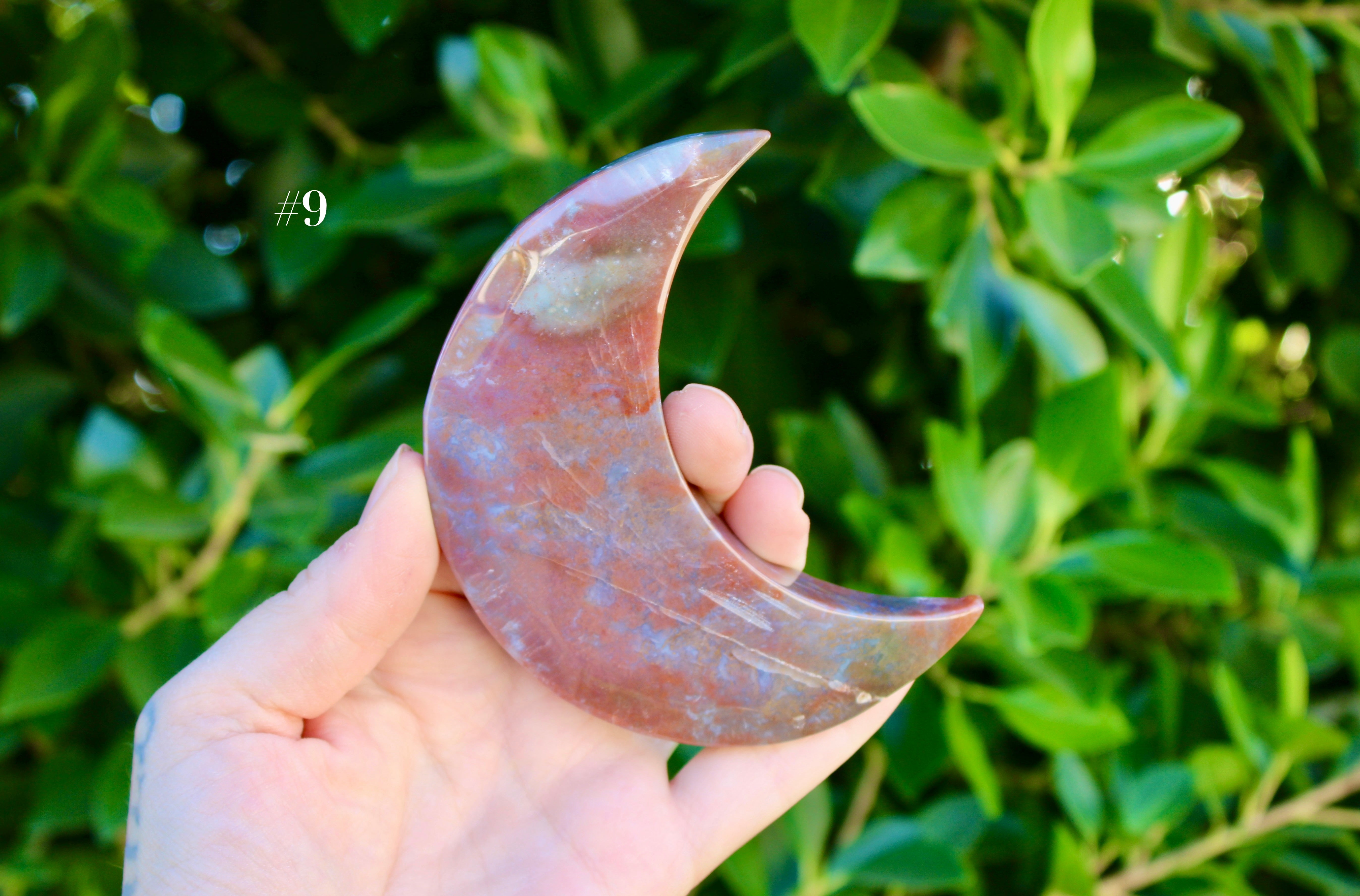 Ocean Jasper Moon Carving – Natural Polished Stone Moon, Pastel Crystal Hand-Carved Jasper Display Piece