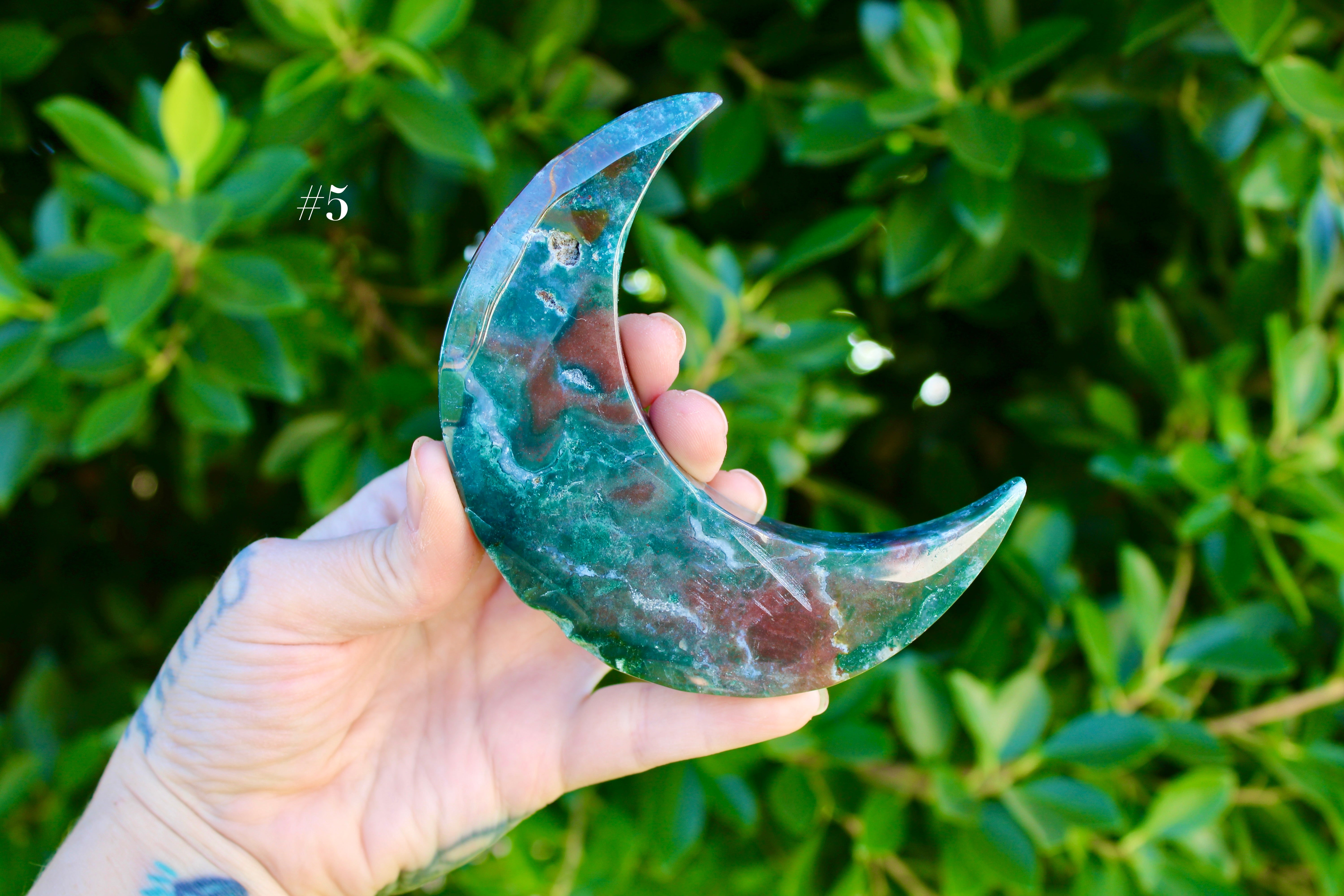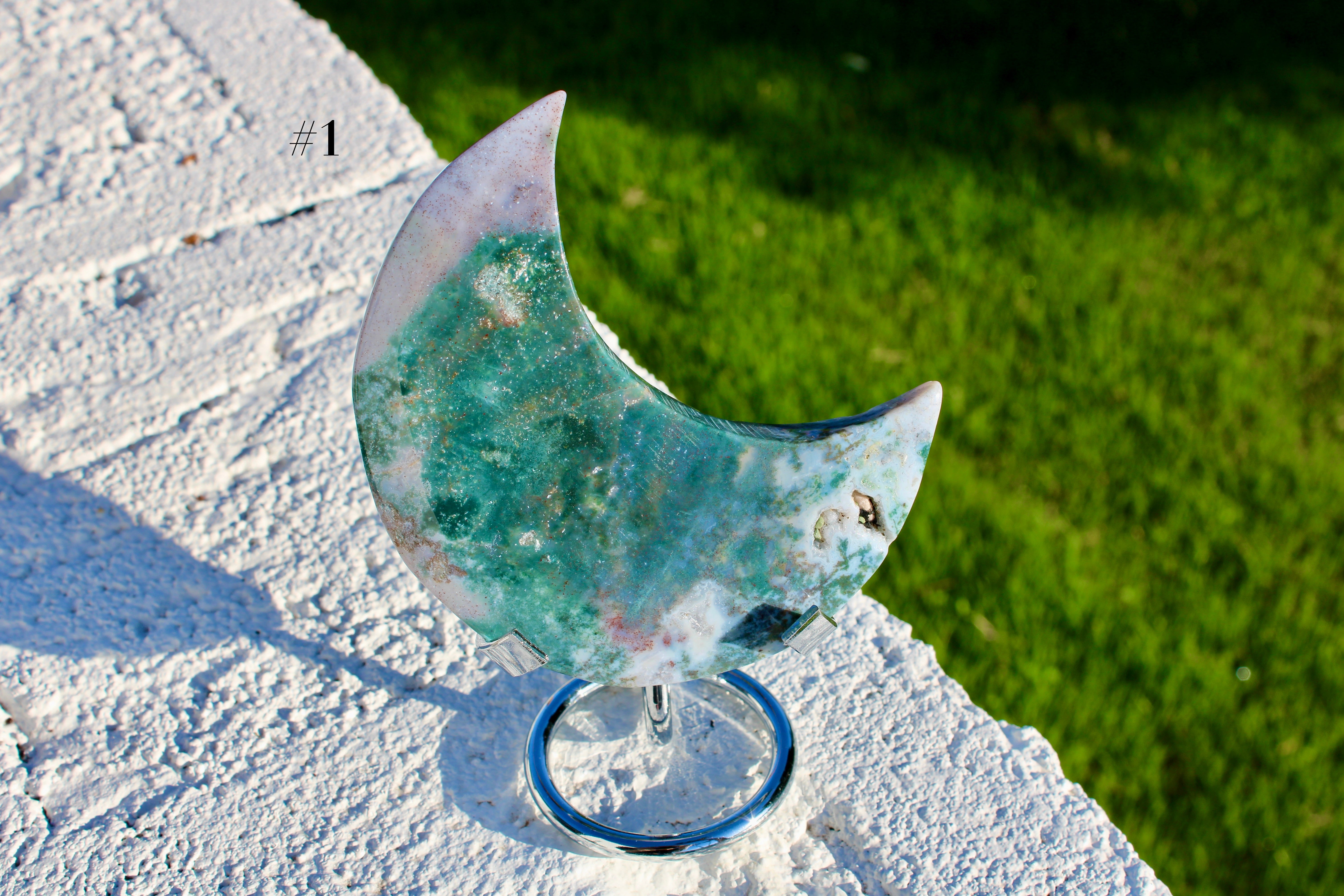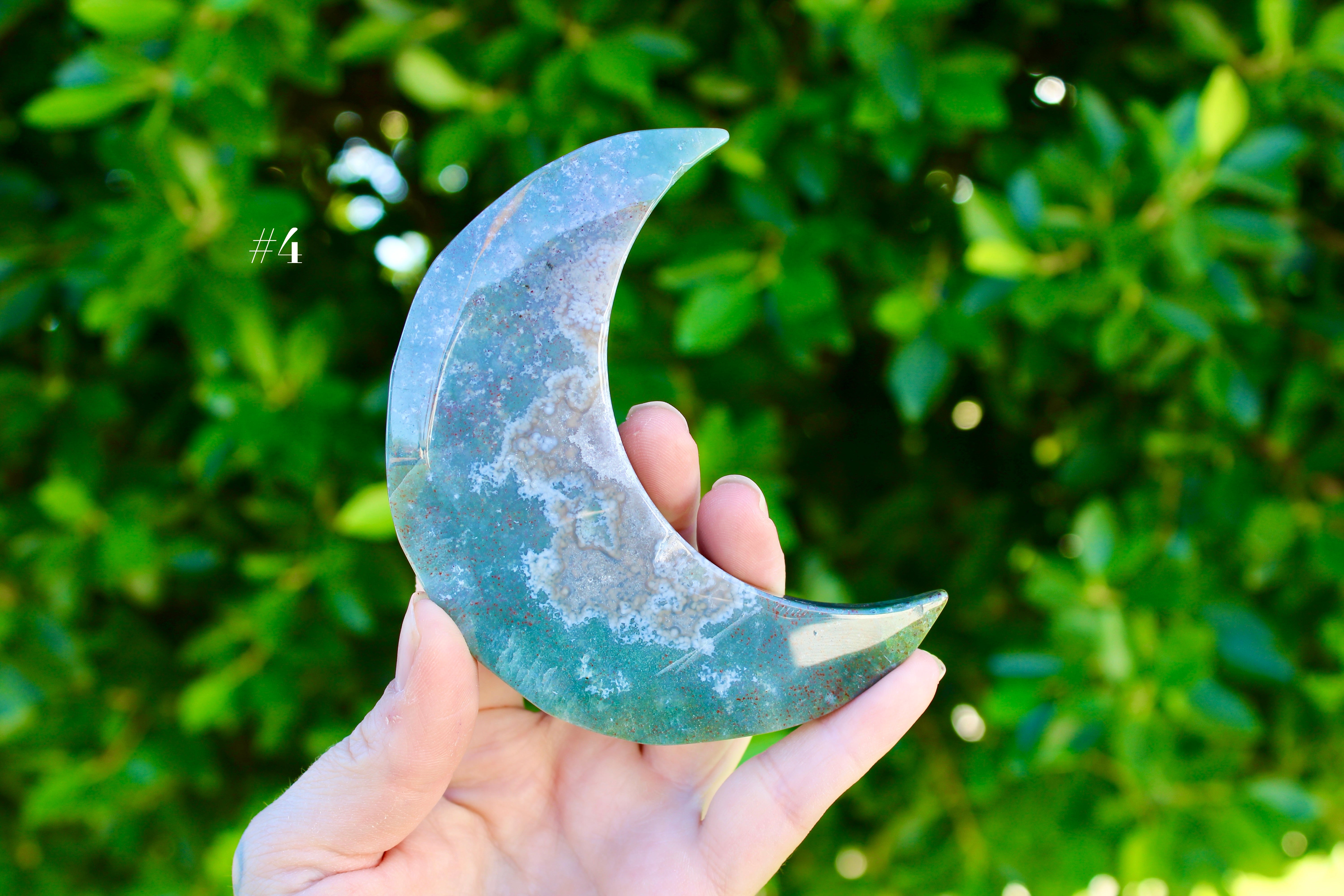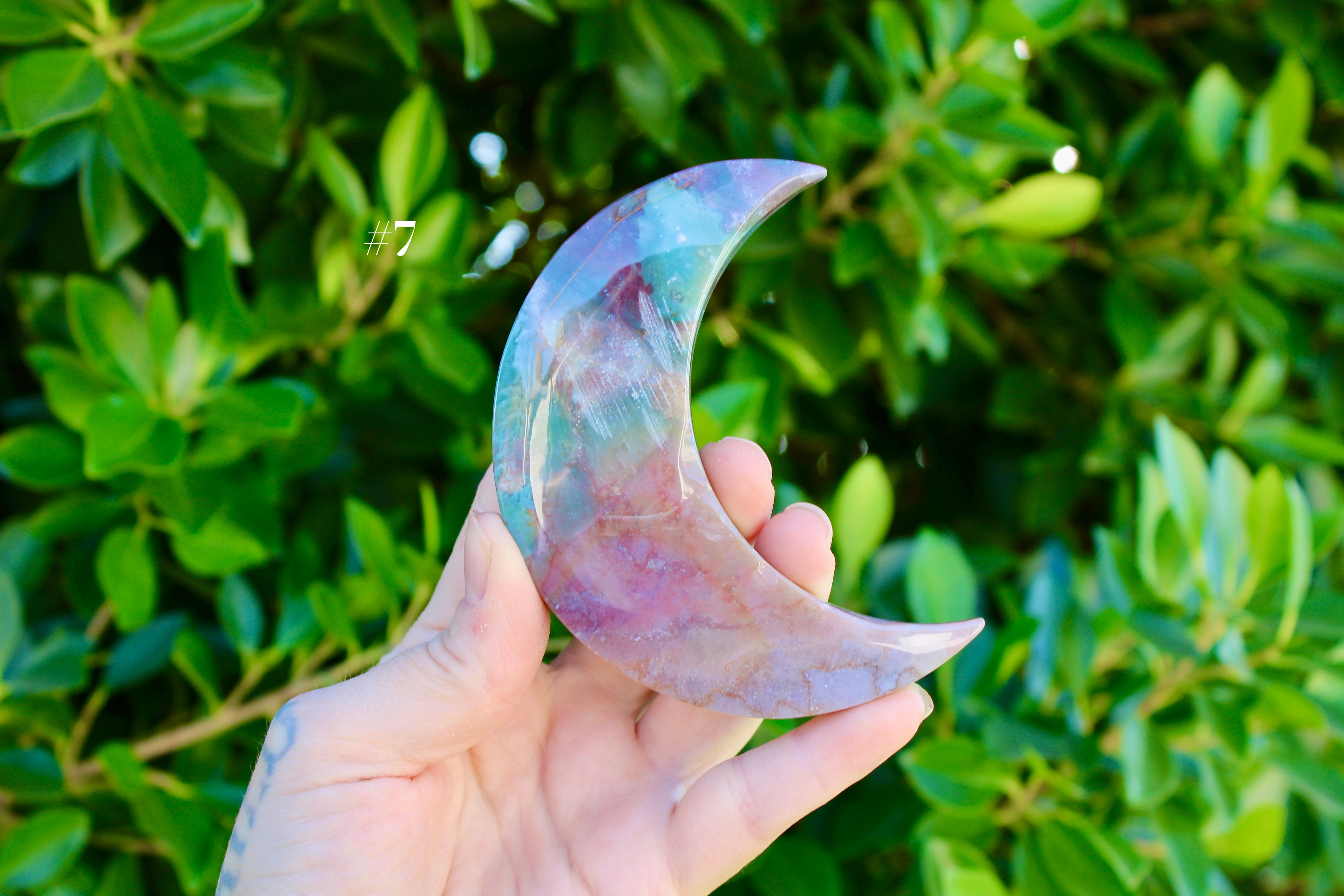 Ocean Jasper Moon Carving – Natural Polished Stone Moon, Pastel Crystal Hand-Carved Jasper Display Piece