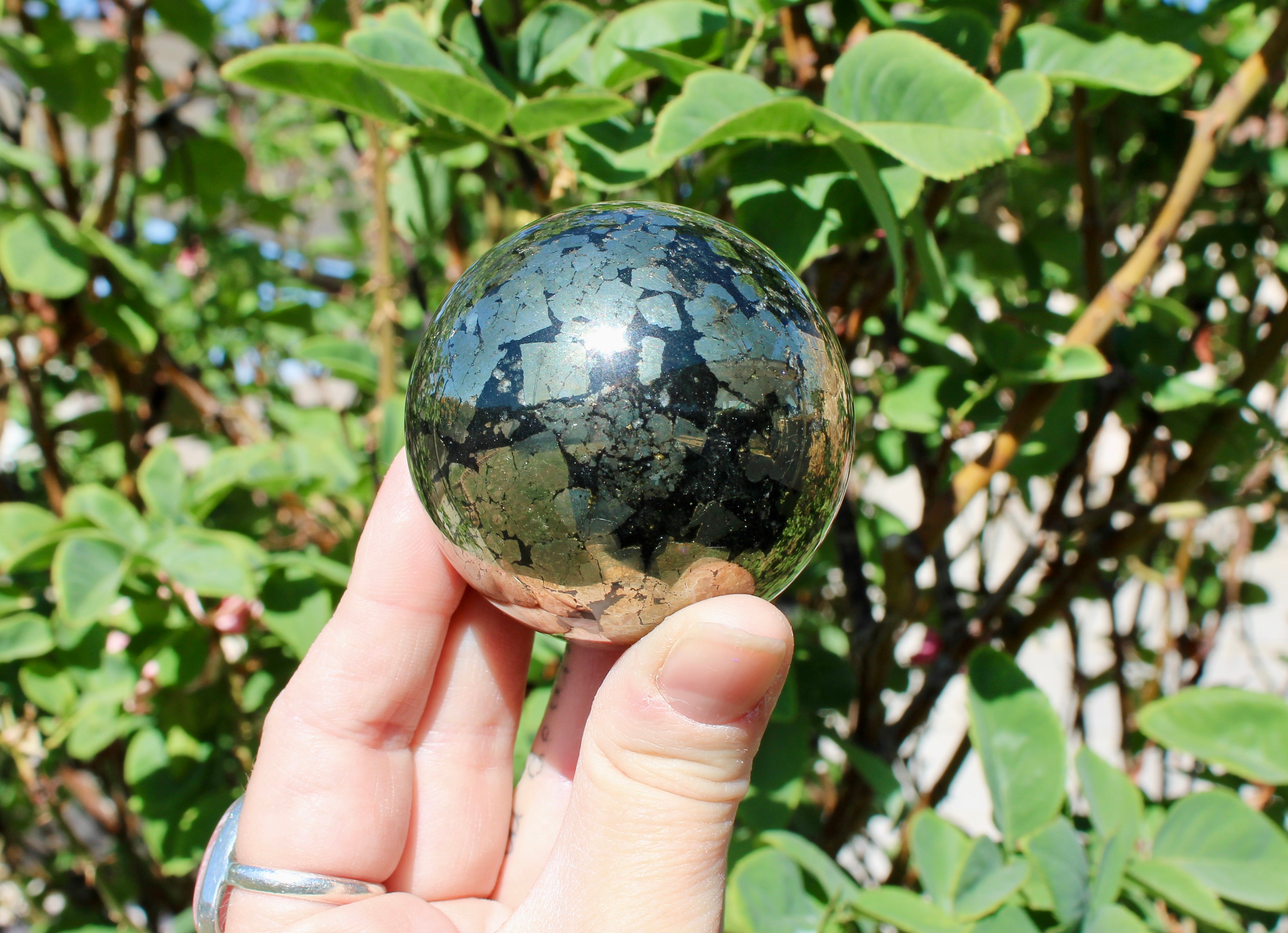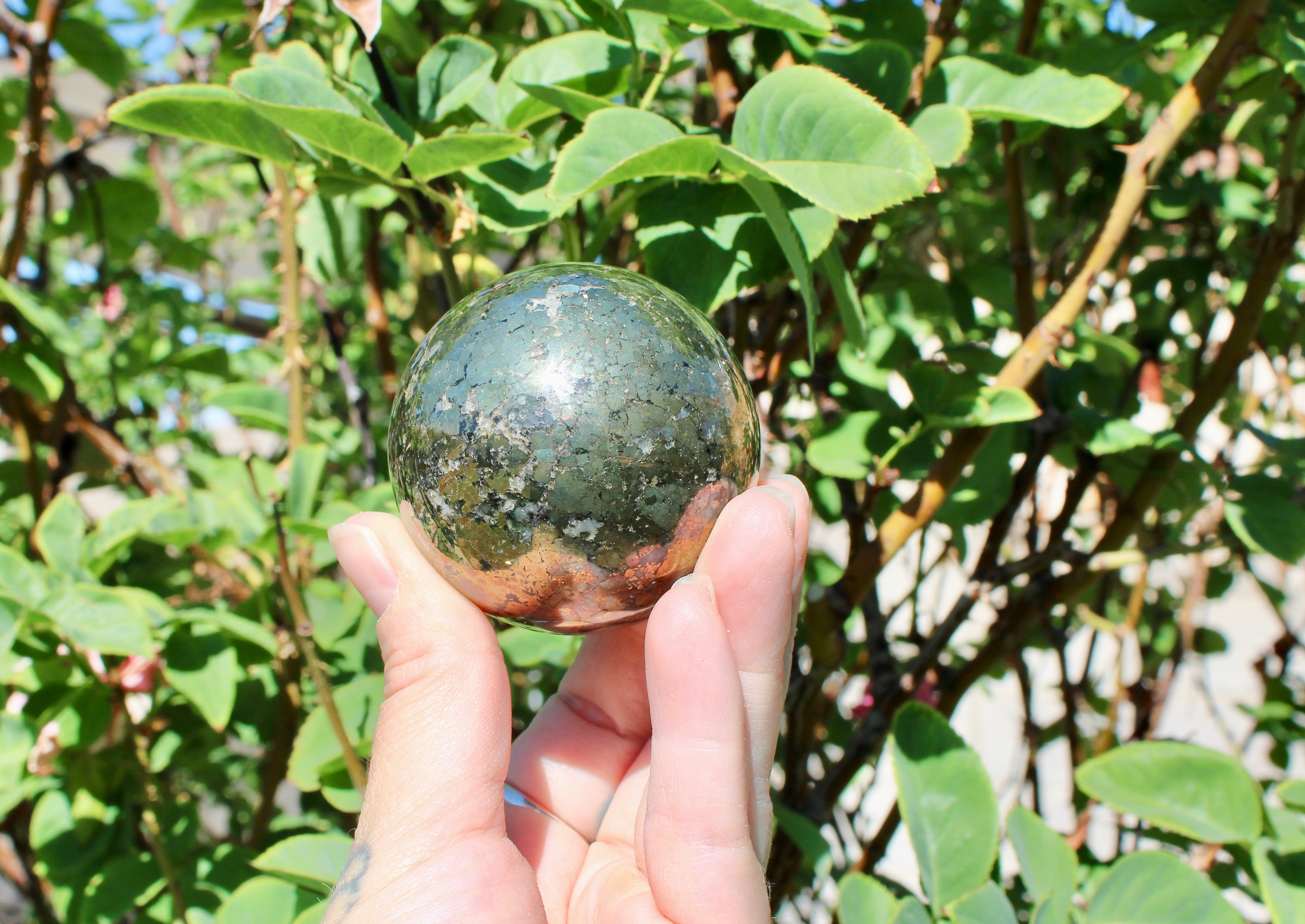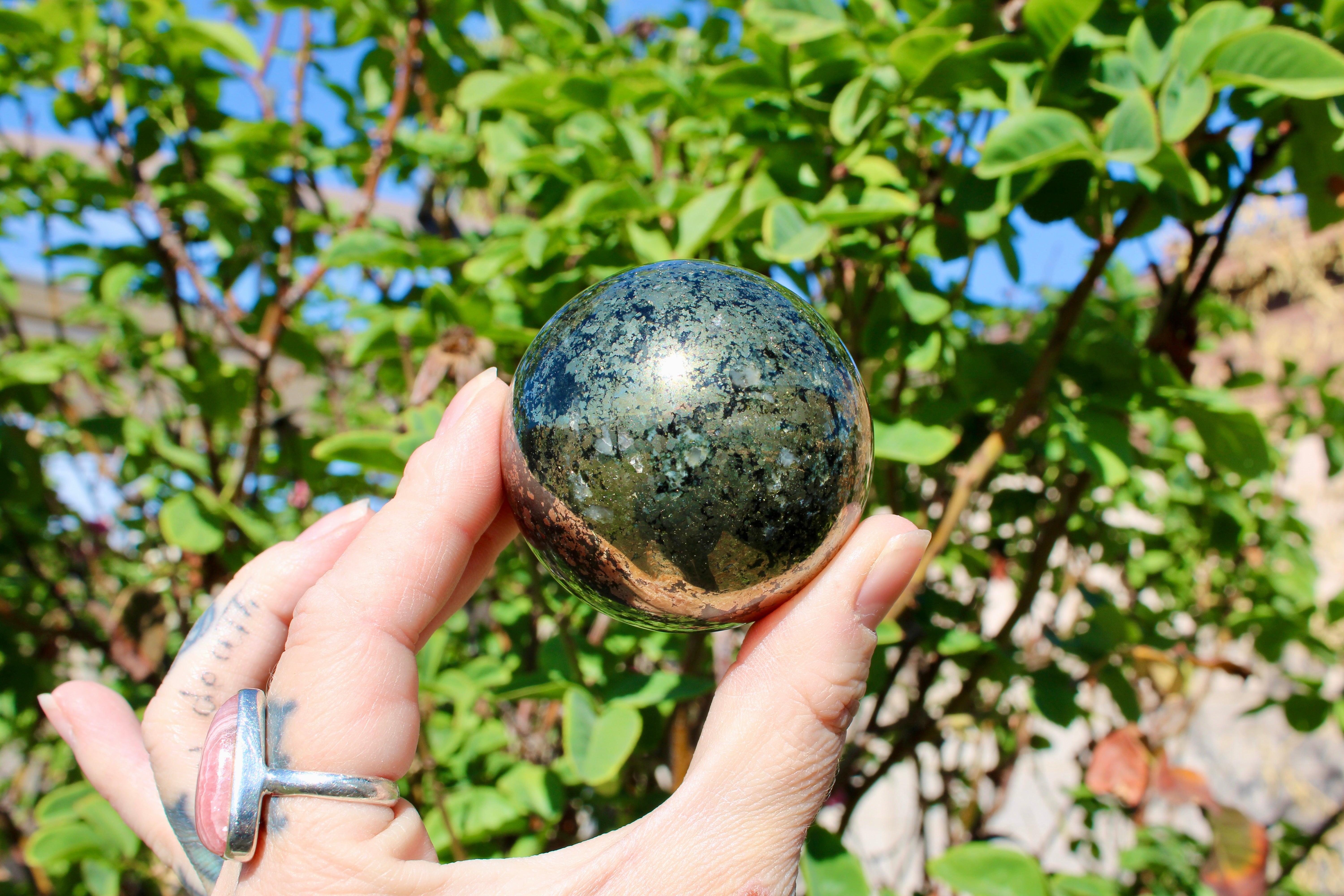 Pyrite Sphere – Natural Polished Crystal Ball, Gold Stone Display Piece. Plastic Stand is Included