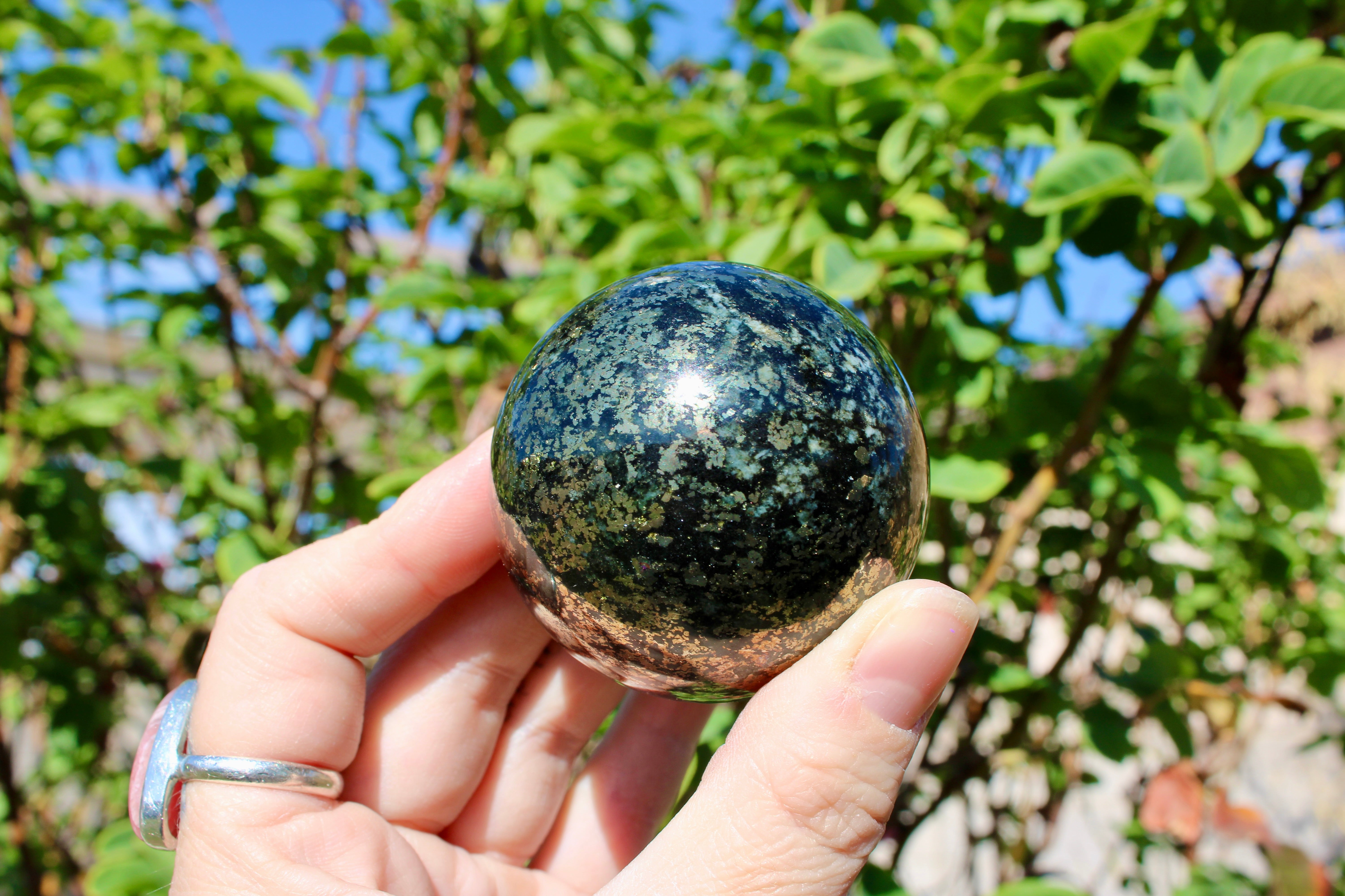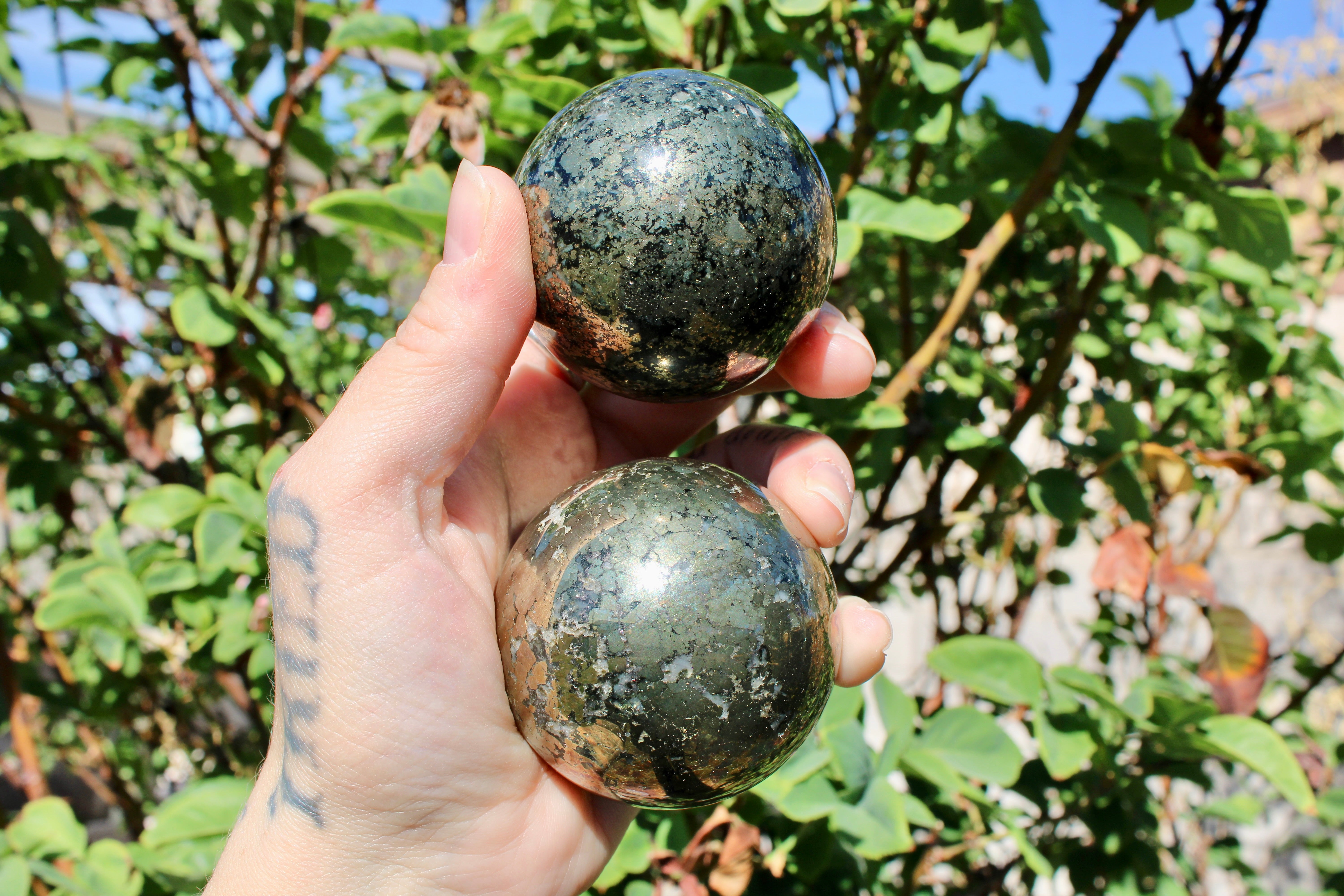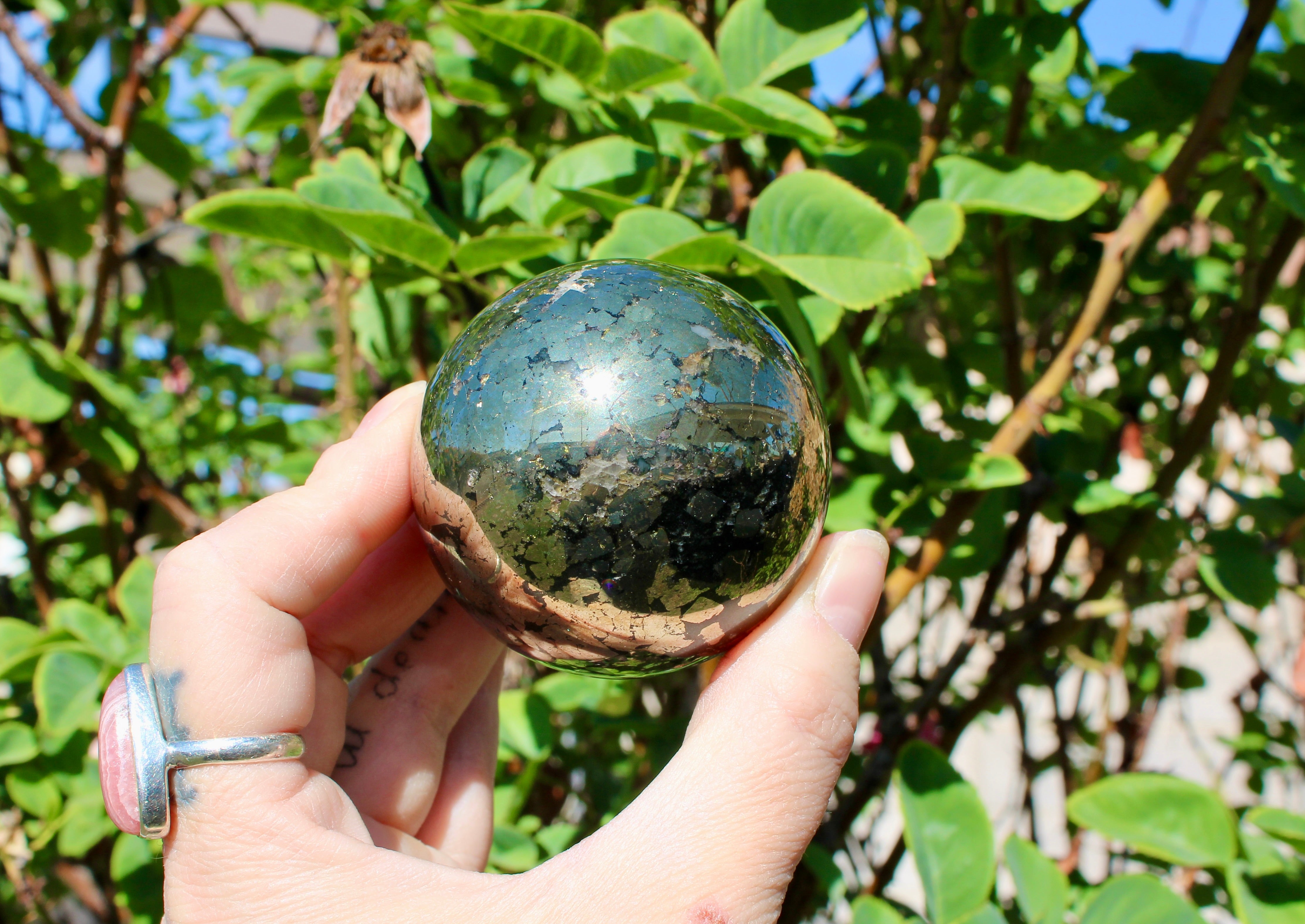 Pyrite Sphere – Natural Polished Crystal Ball, Gold Stone Display Piece. Plastic Stand is Included