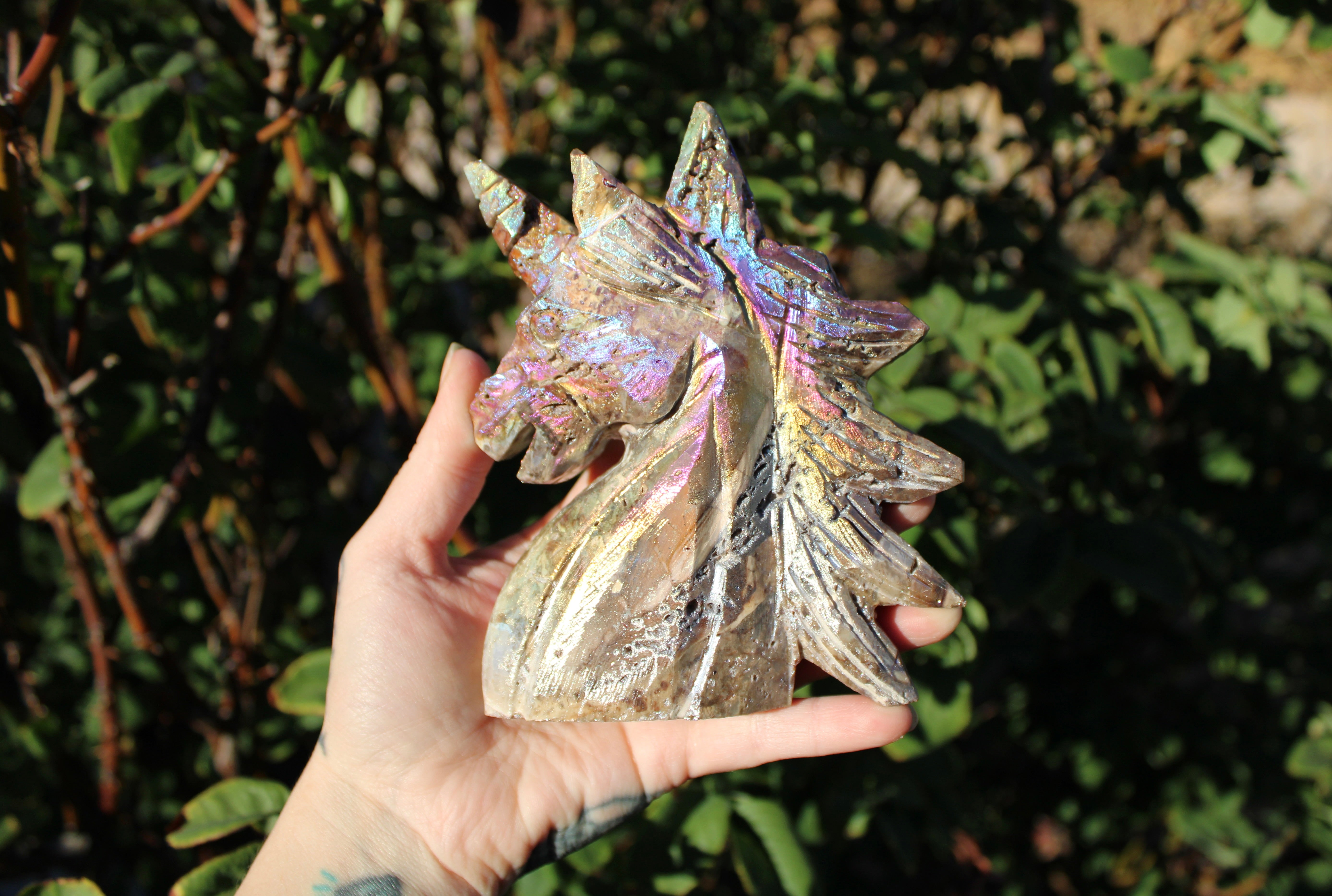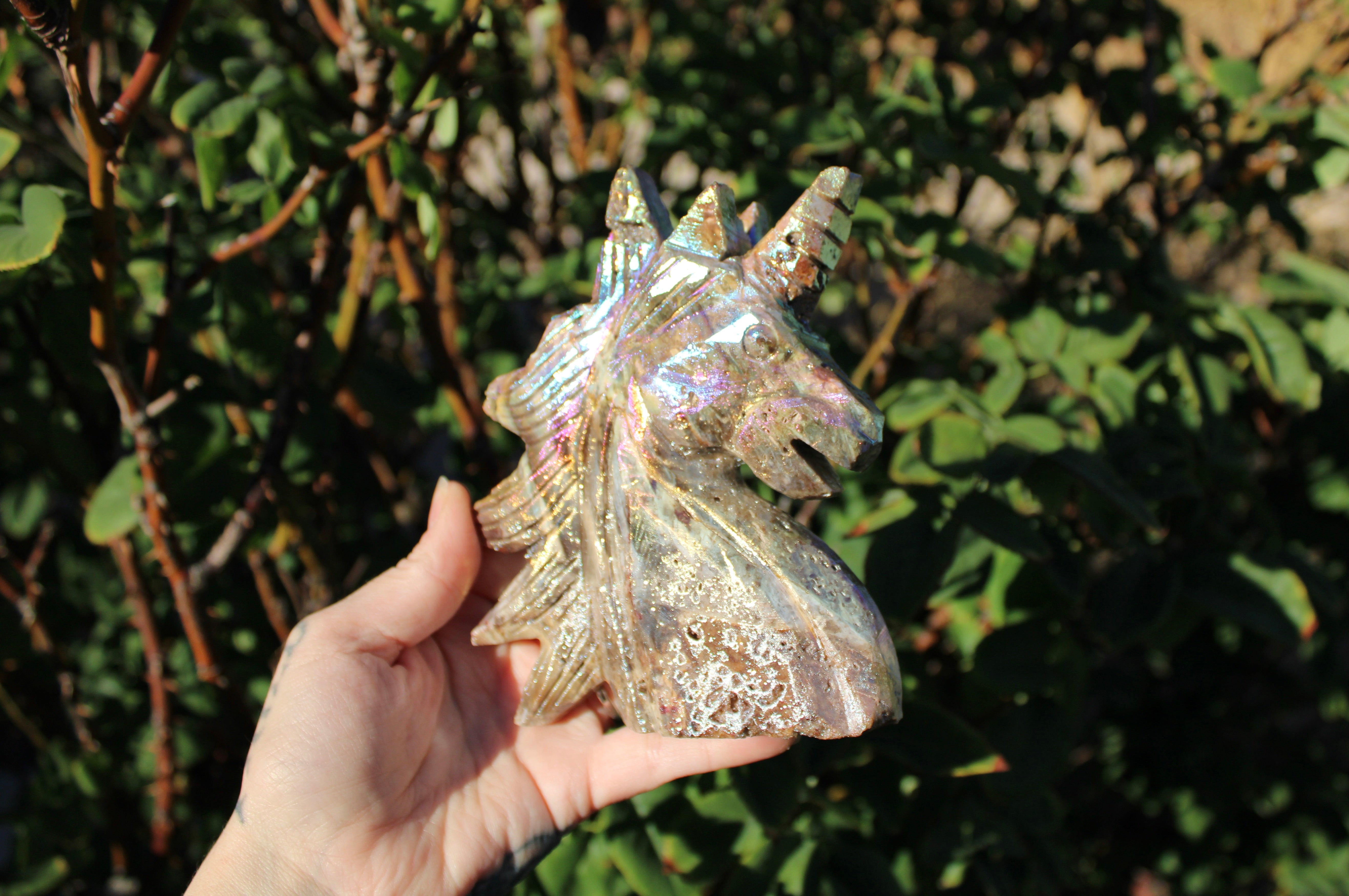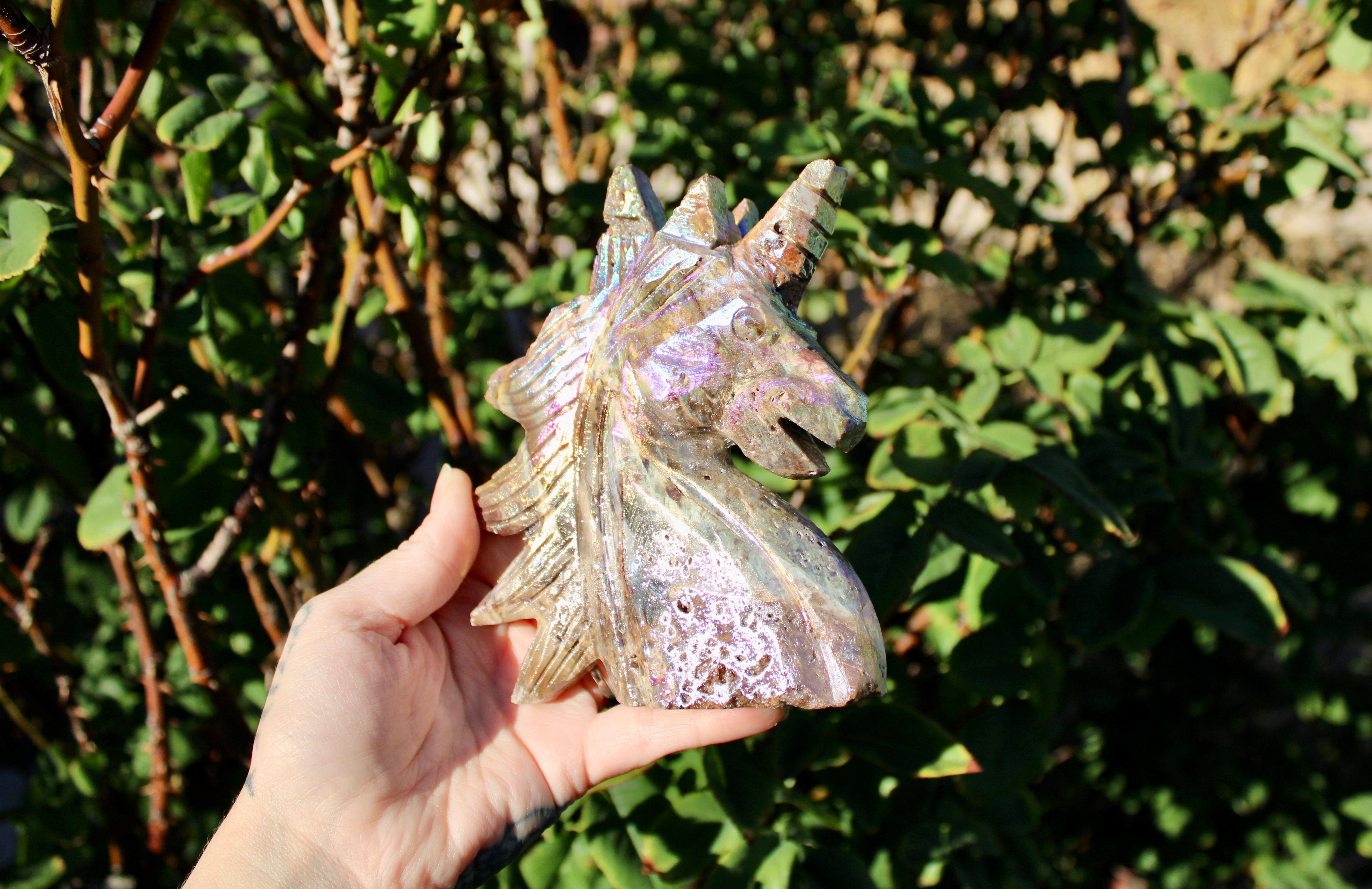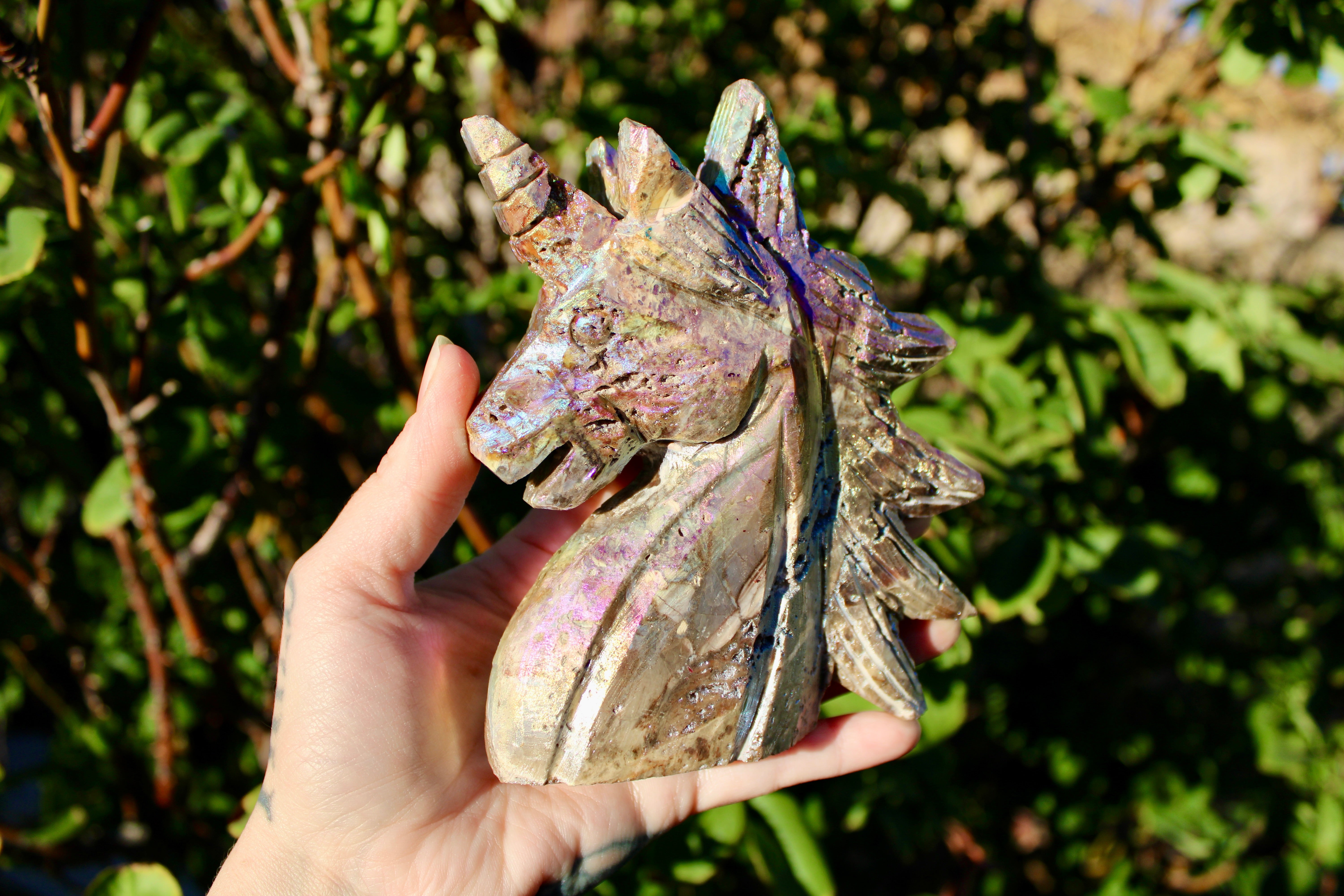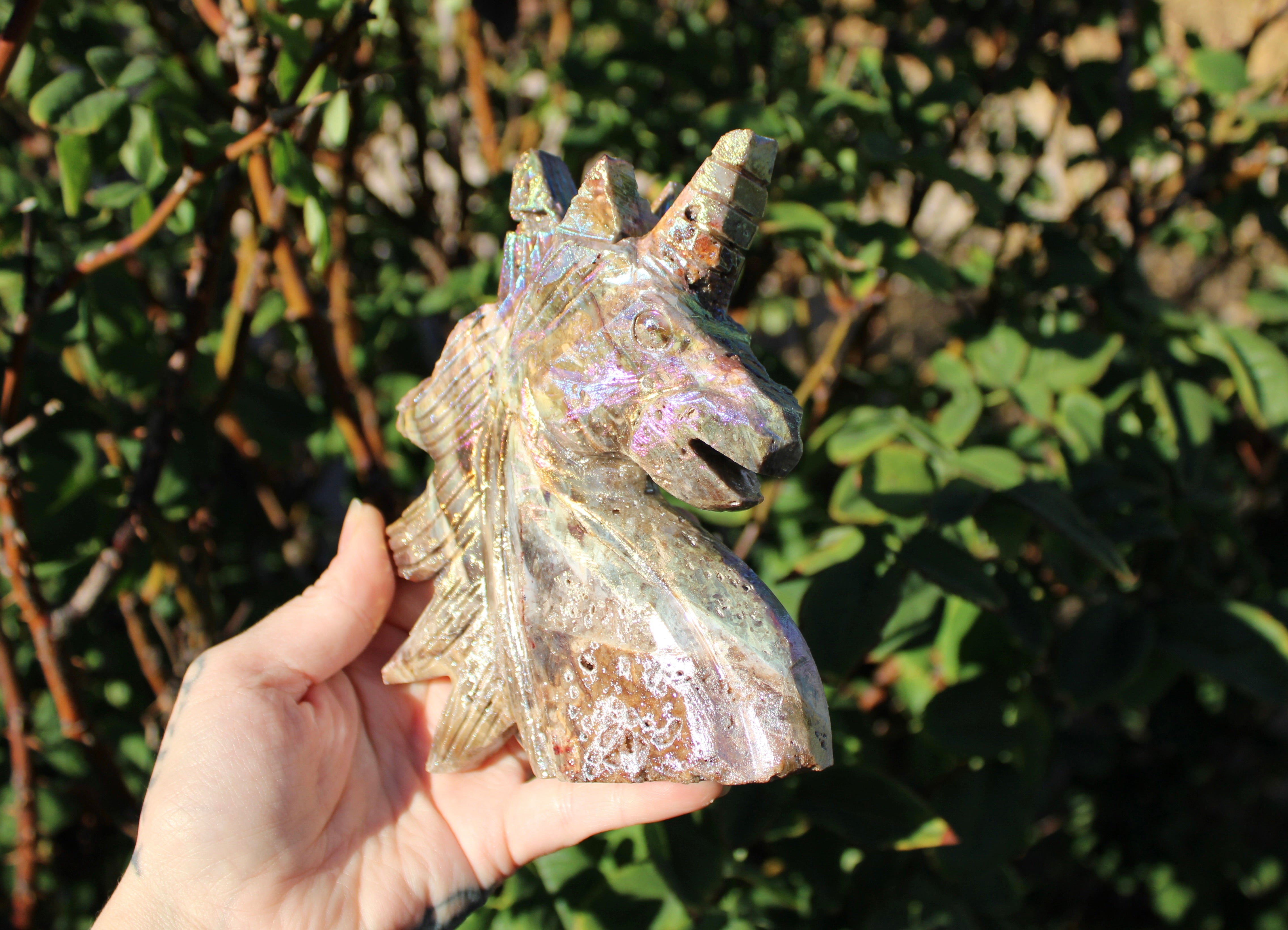 Rainbow Aura Sphalerite Unicorn Stone Carving – Polished Crystal Unicorn Display Piece