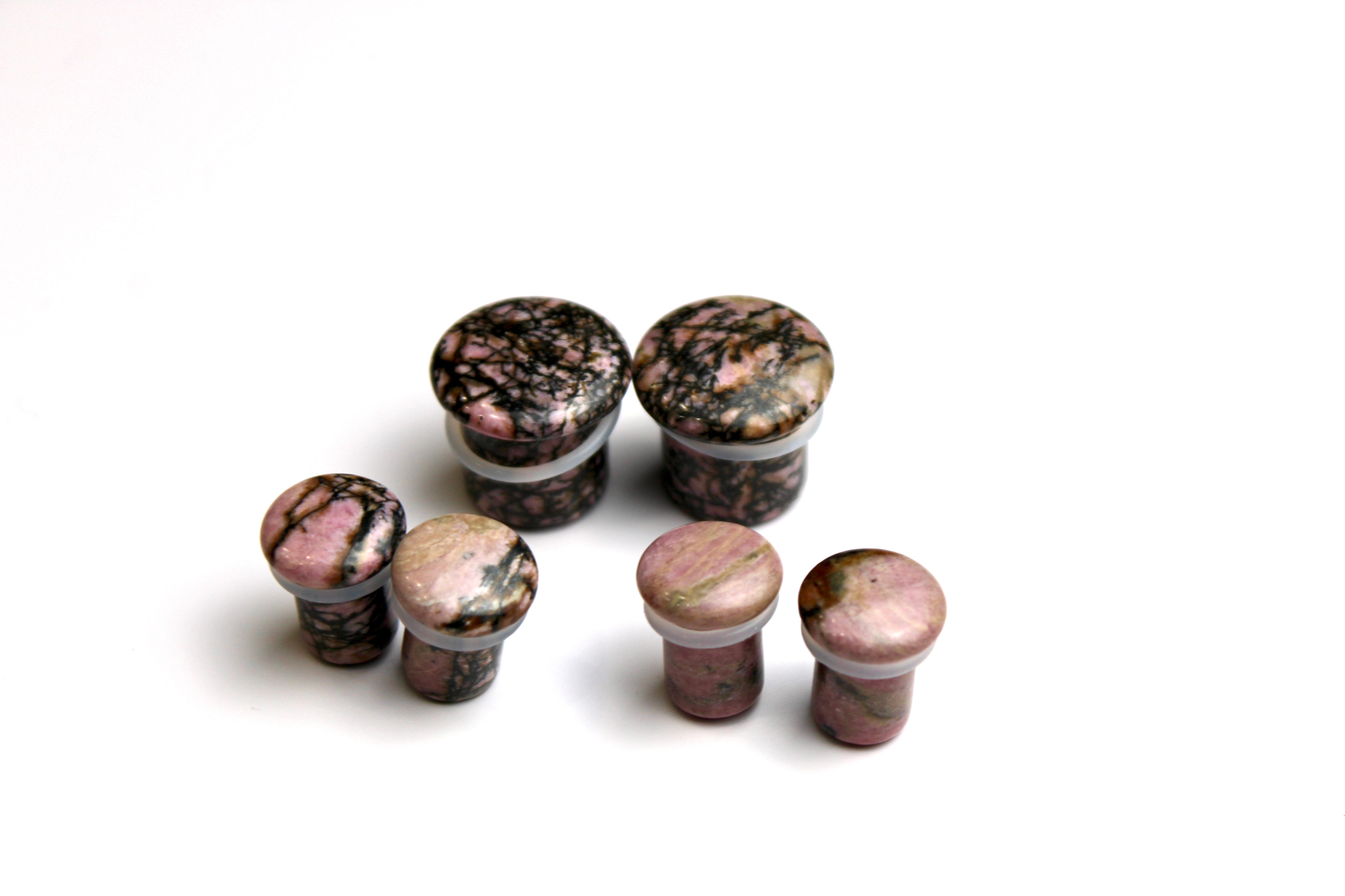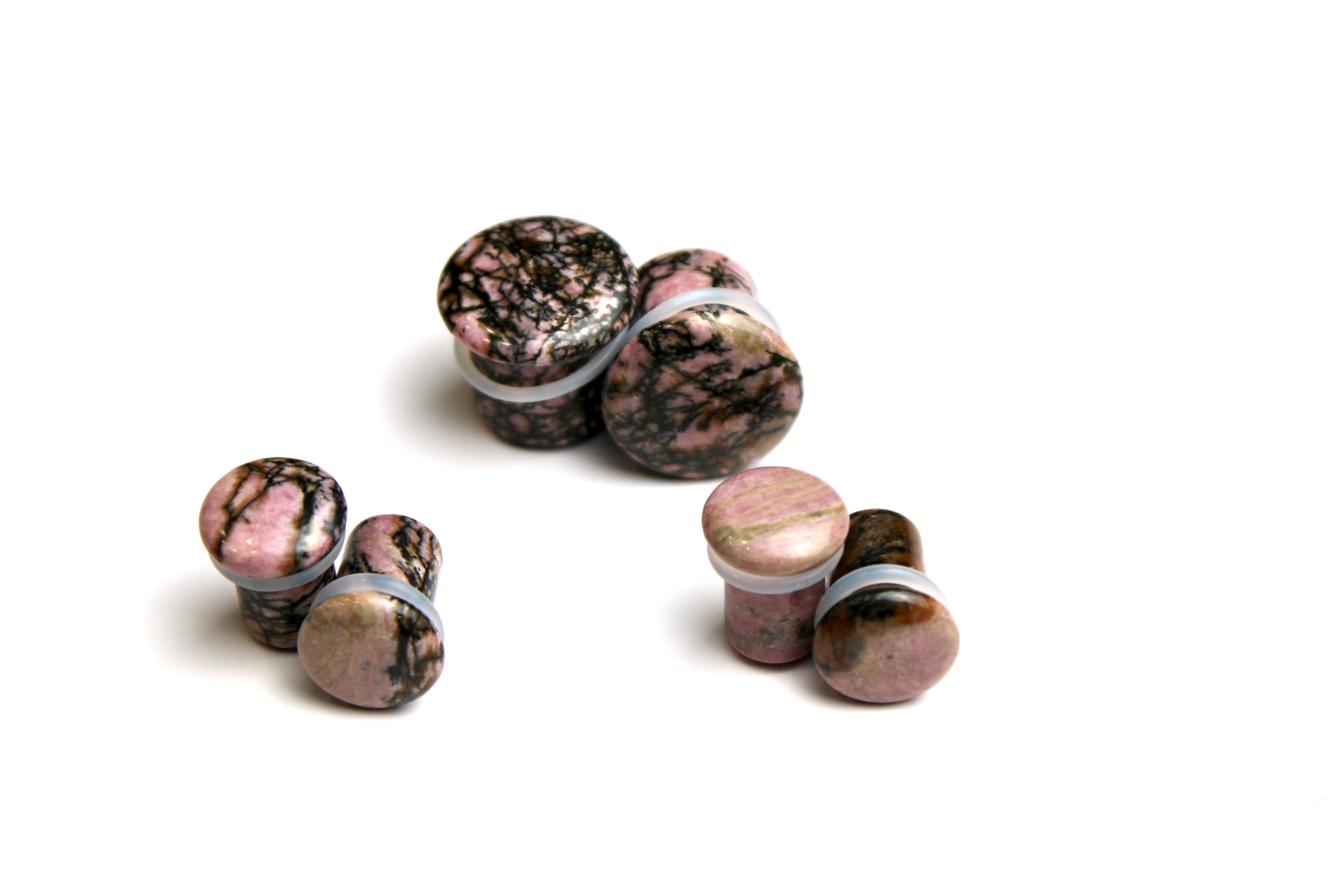 Rhodonite Stone Single Flared Plugs - Pink and Black Webbed Gauges Pair Material: Genuine Rhodonite Garnet StoneColor: Deep raspberry pink... Read more